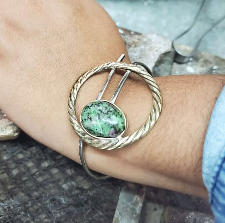 Esclava de alpaca y bronce con piedra jaspe nevado.