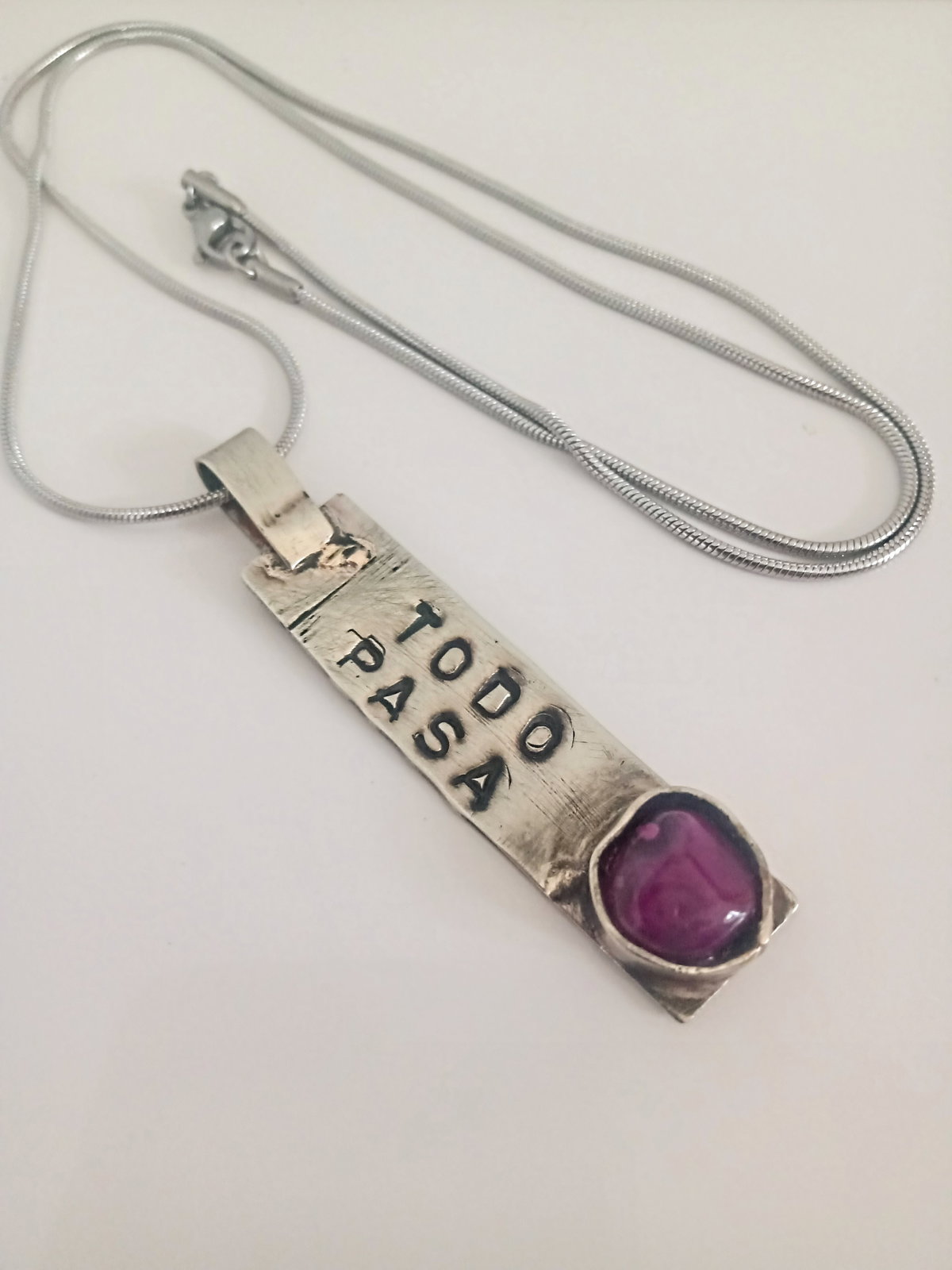 Collar de rectangular con frase todo pasa hecho en alpaca y piedra Agatha fucsia .cadena de acero quirúrgico de 60 CM