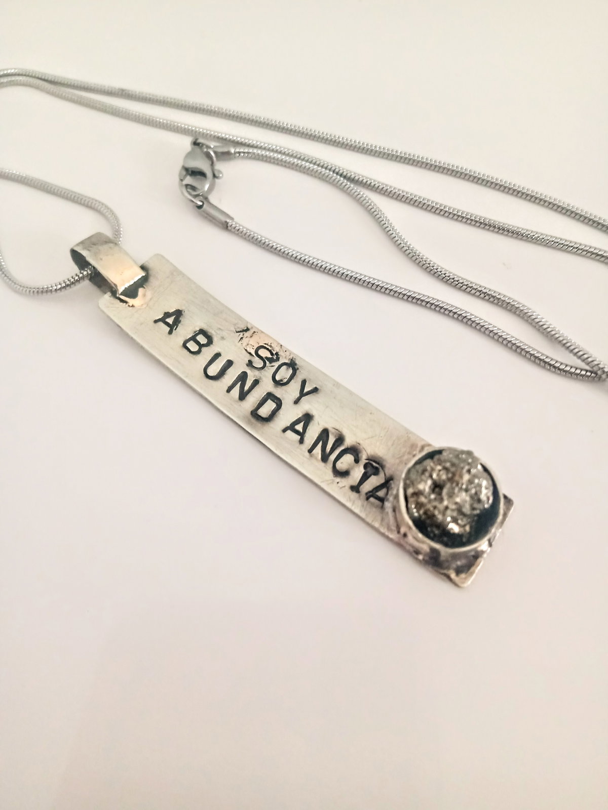 Collar de rectangular con frase soy abundancia de alpaca y piedra Pirita .cadena de acero quirúrgico de 60 CM