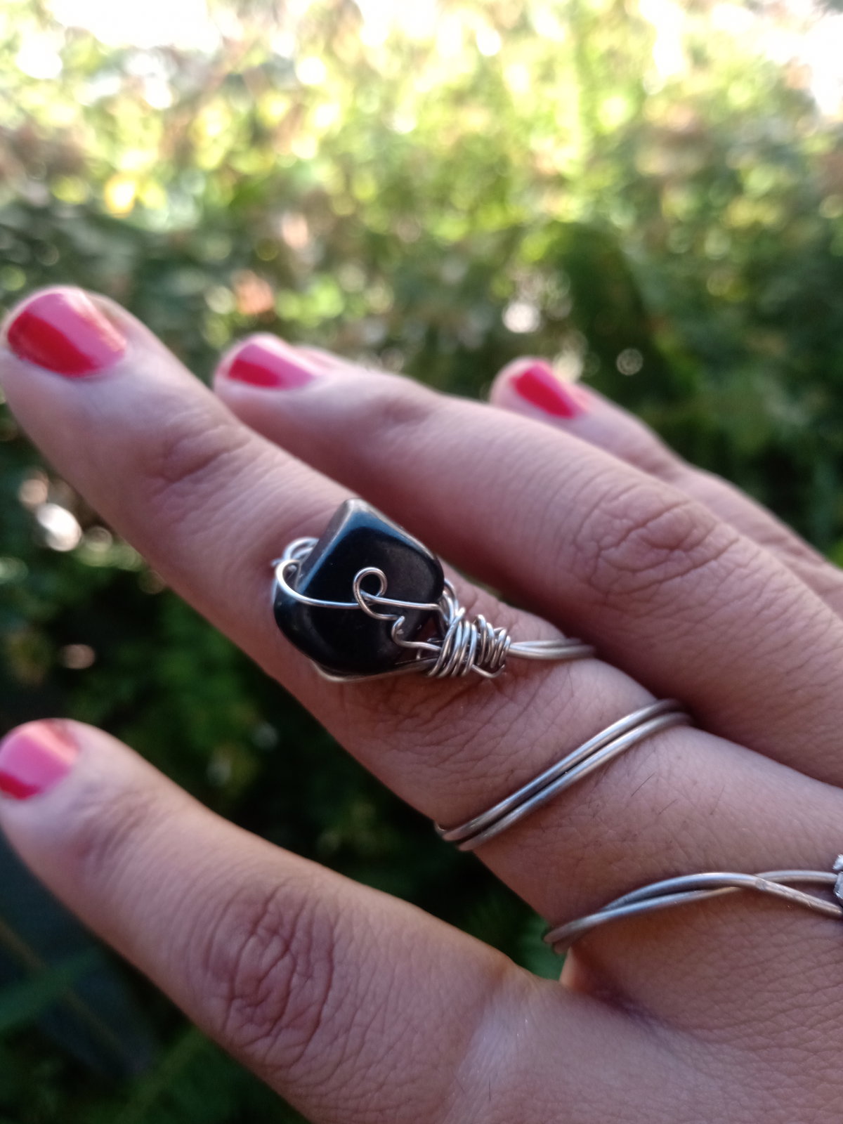 Anillo de alambre de alpaca con piedra obsidiana. Se ajusta cualquier dedo.