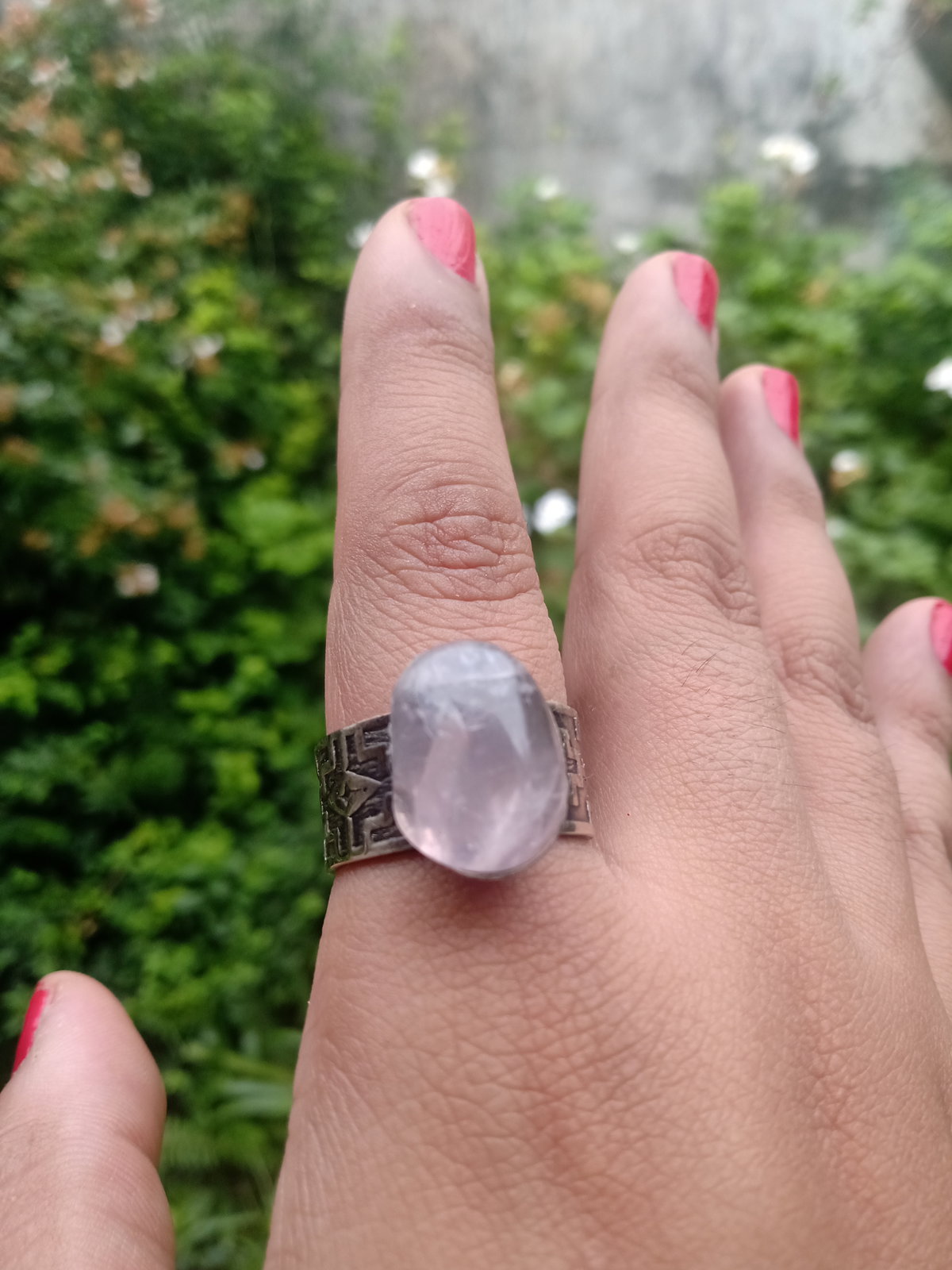 Anillo de alpaca con piedra cuarzo rosa. Ajustable