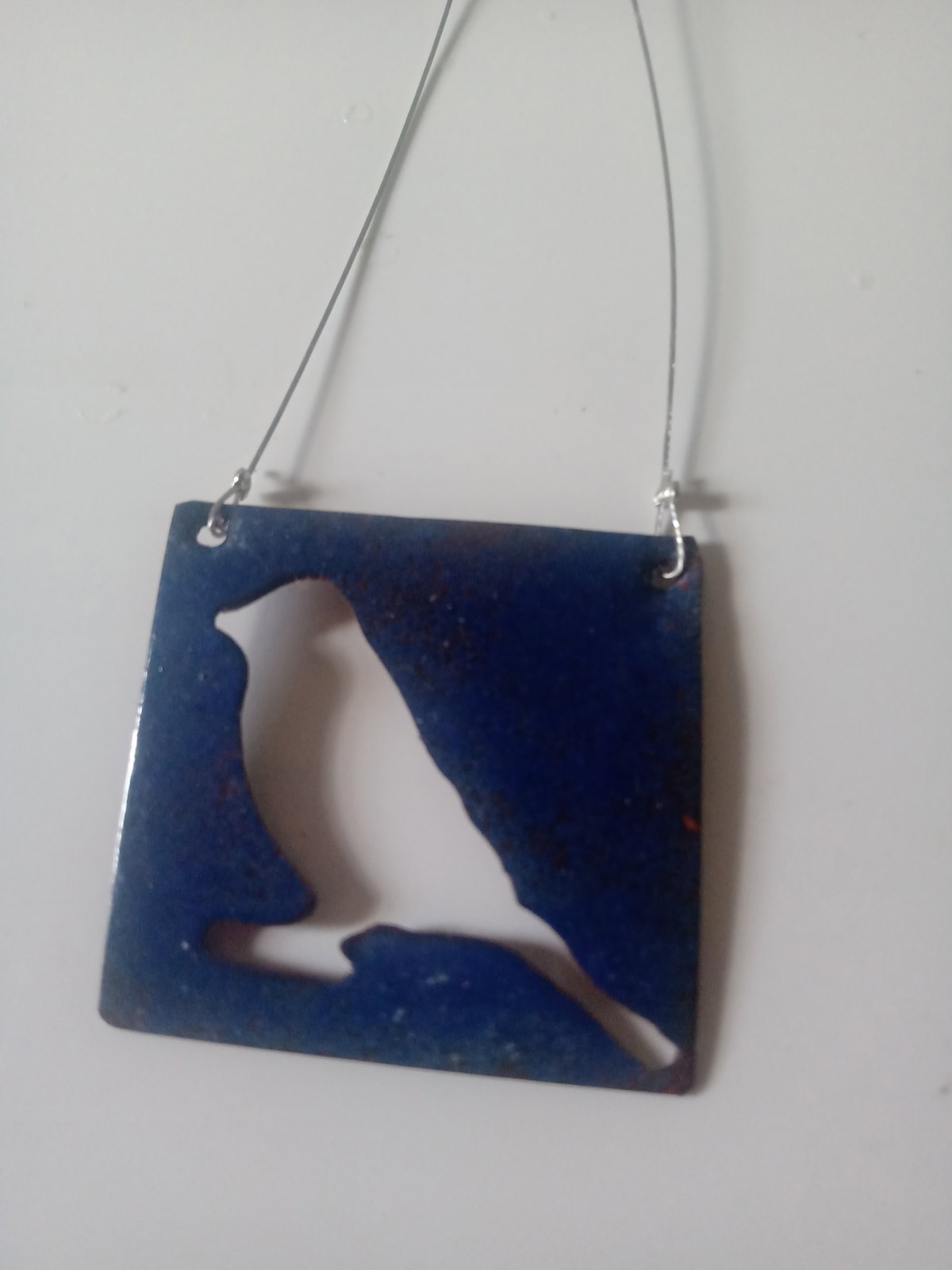 Collar esmaltado a fuego con diseño de pajaro color azul con tanza de acero.