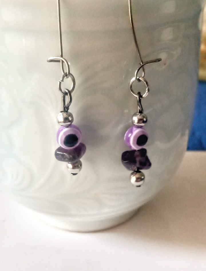 Aros de ojos turco violeta con una piedra escalla de piedras natural amatista y mostacillas plateada. Ganchos de acero quirúrgico es hipoalergénico, inoxidable e inalterable. El pasante por dentro del ojo turco y la piedra es de aleación de níquel