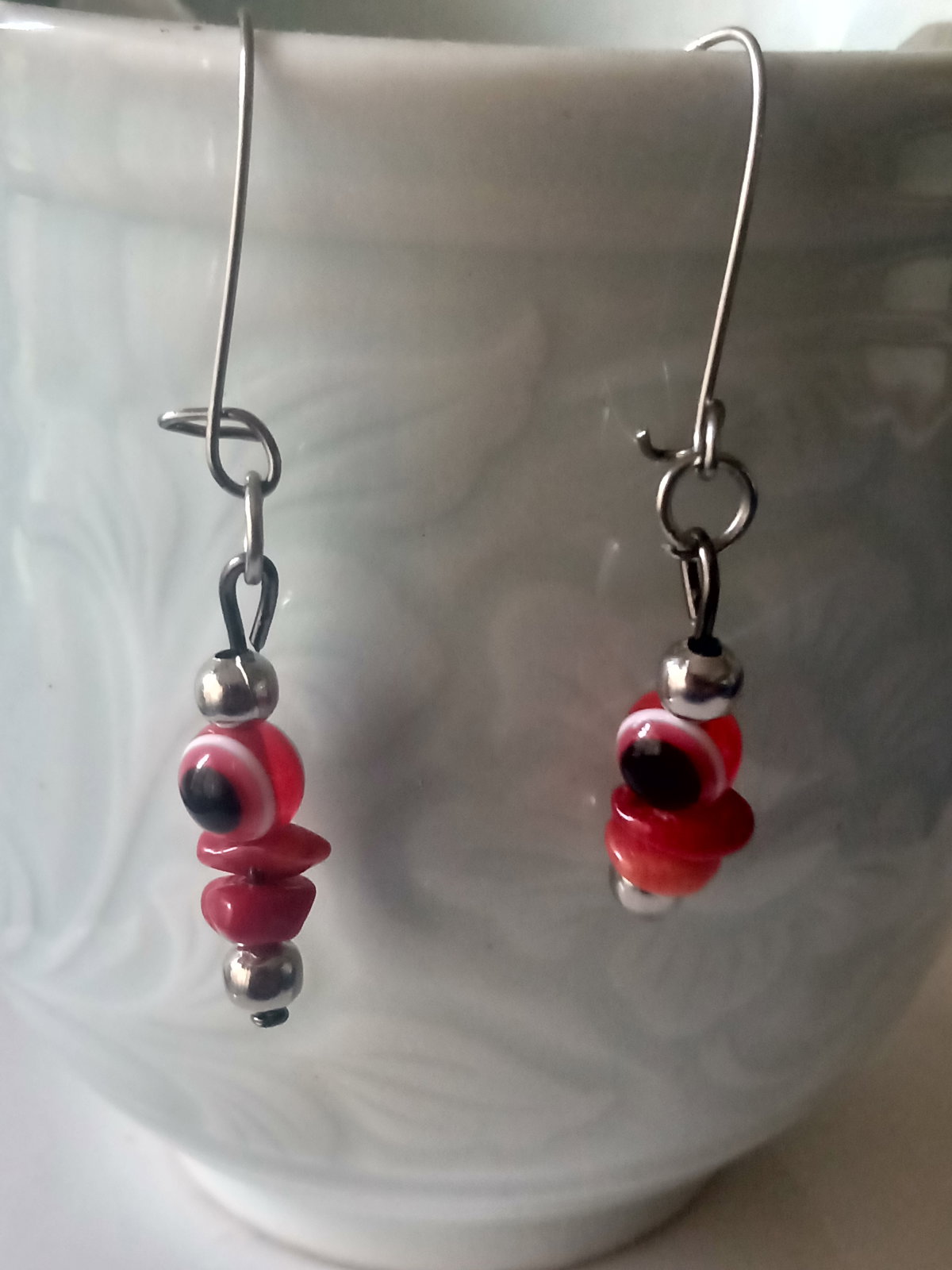Aros de ojos turco rojo con una piedra escalla de piedras natural coral y mostacillas plateada. Ganchos de acero quirúrgico es hipoalergénico, inoxidable e inalterable. El pasante por dentro del ojo turco y la piedra es de aleación de níquel