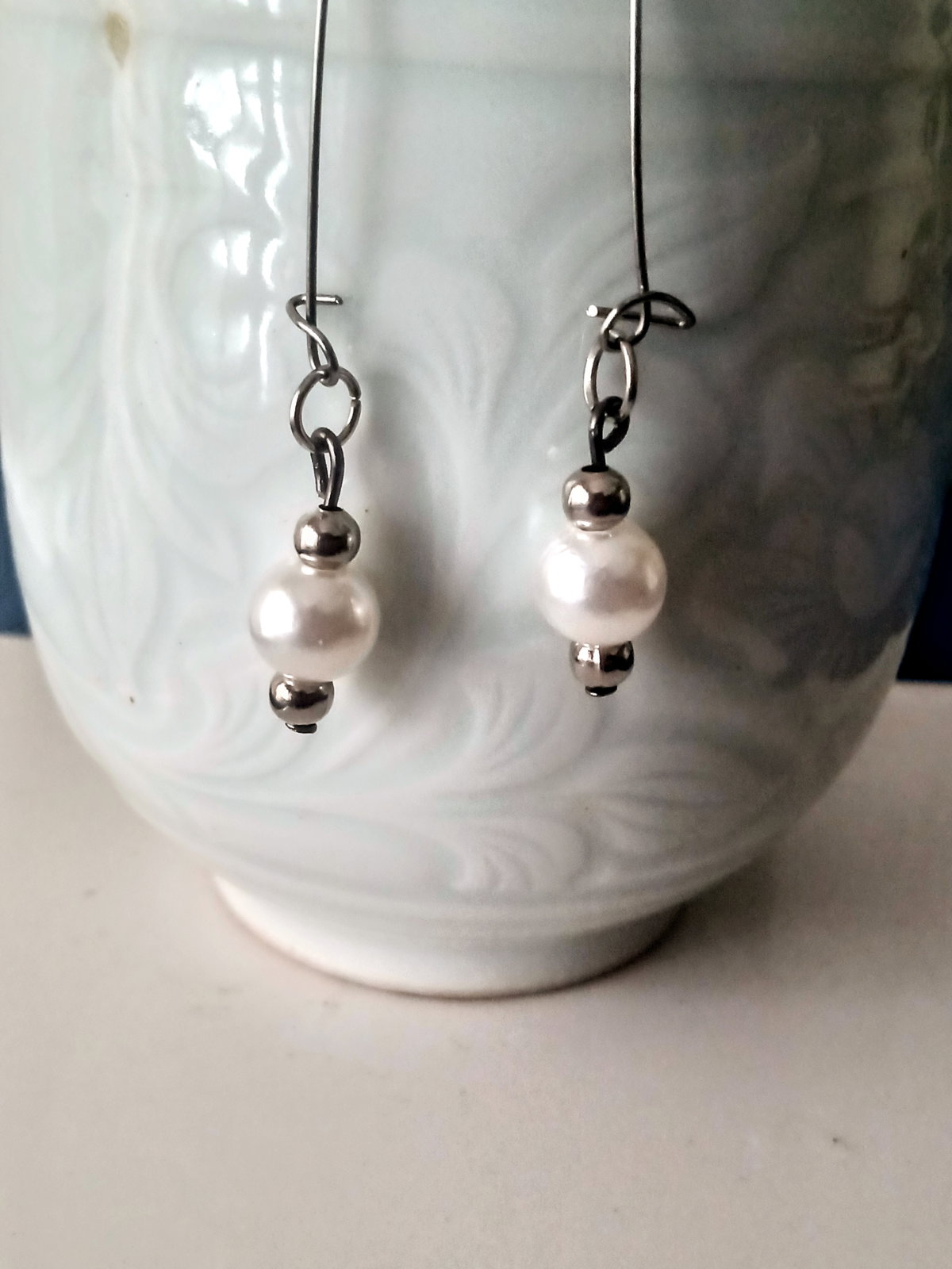 Aros de perlas con pequeña mostacilla plateada. Ganchos de acero quirúrgico es hipoalergénico, inoxidable e inalterable. El pasante por dentro de la perla es de aleación de níquel.