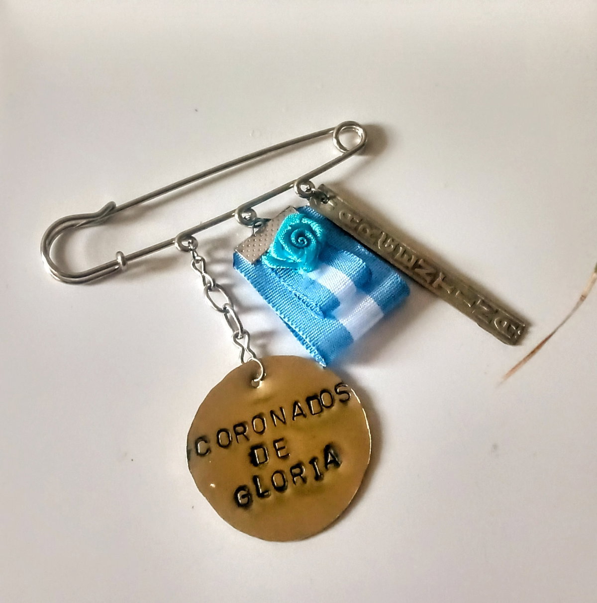 Dijes de bronce con incripción coronados de gloria circular de Bronce, y rectangular de argentina de alpaca. cintas Argentina y una pequeña flor de tela color azul. Gancho alfiler fundición níquel 6 cm aprox.