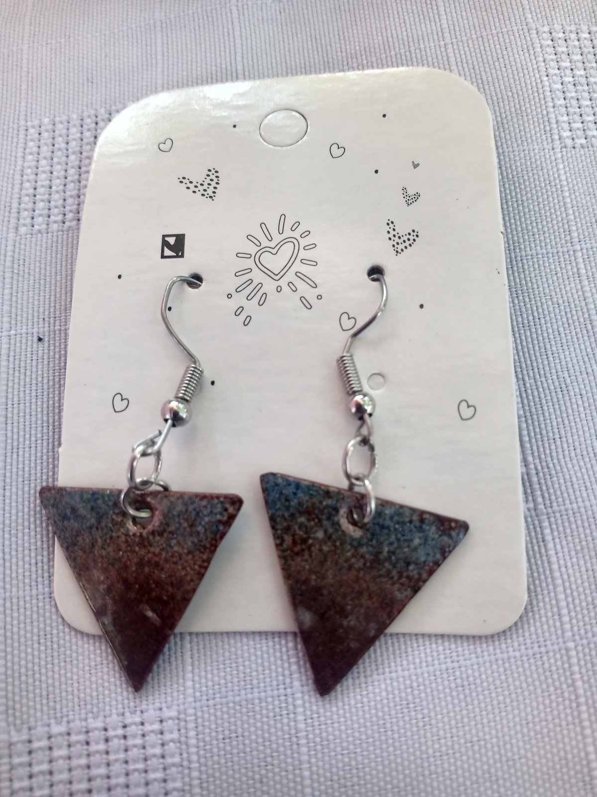Aros triángulos de cobre esmaltado de fuego. Con pasante de acero quirúrgico.