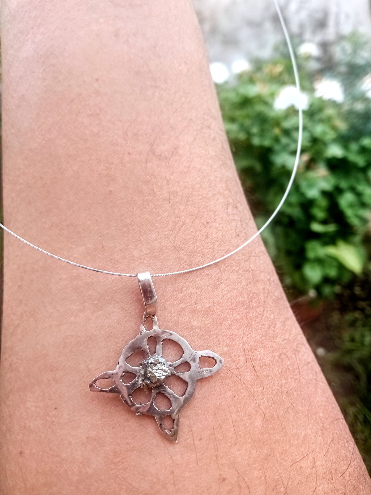 Collar nudo de bruja hecho en alpaca con piedra Pirita.