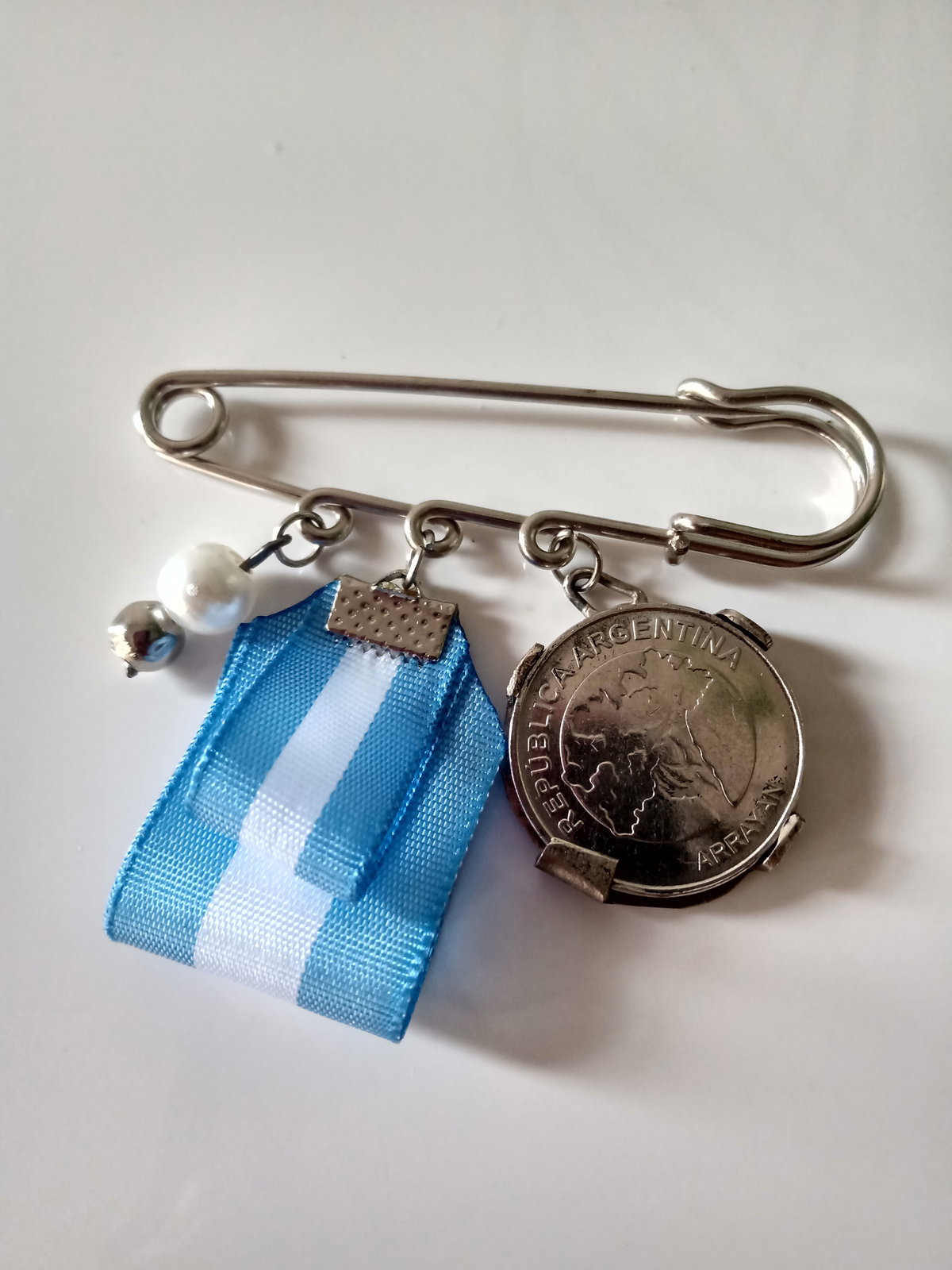Escarapela Con pequeño dije de perla blanca y moneda engarzada en alpaca , cintas Argentina. Gancho alfiler fundición níquel 6 cm aprox.