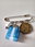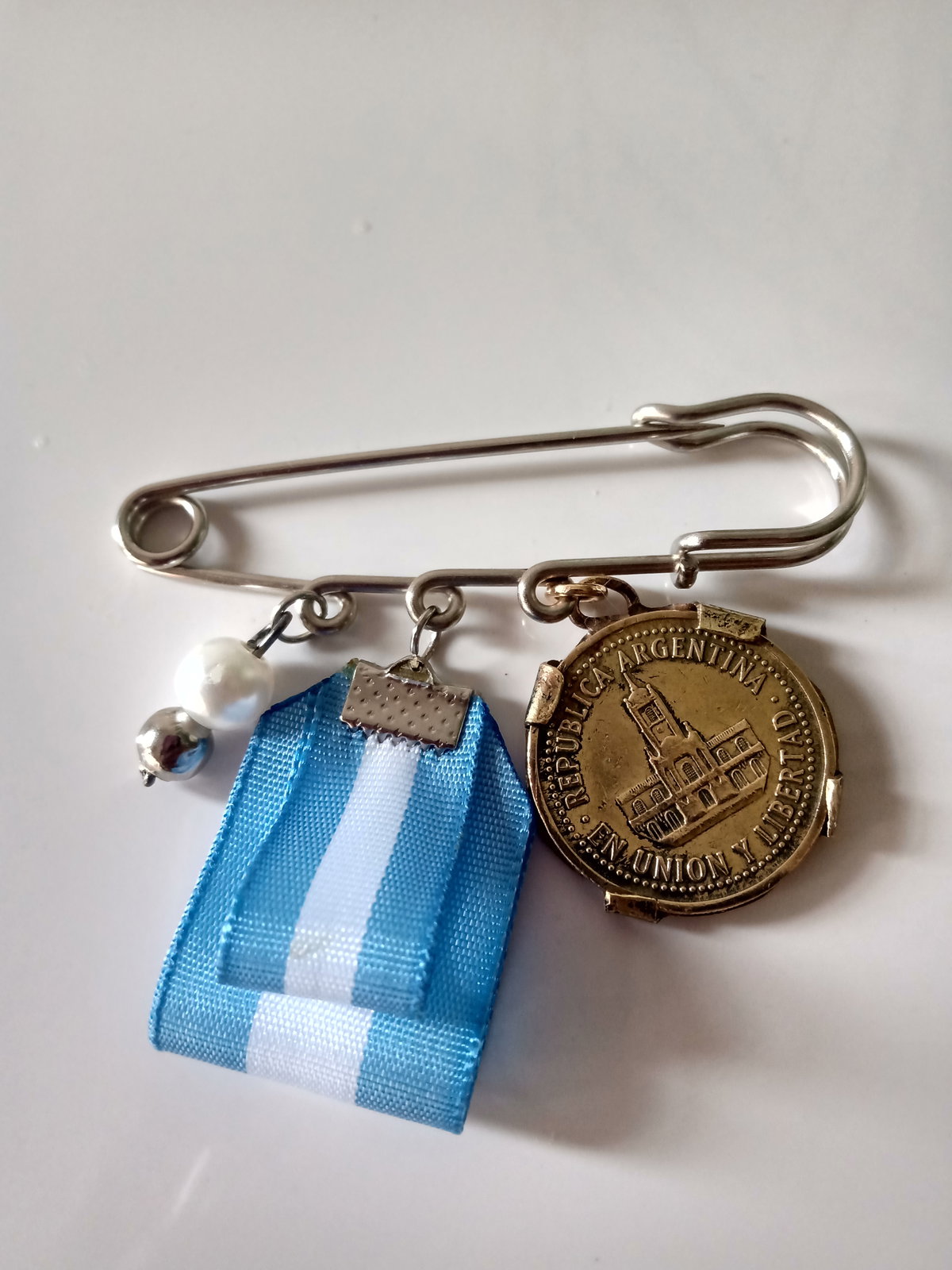Escarapela Con pequeño dije de perla blanca y moneda engarzada en bronce con , cintas Argentina. Gancho alfiler fundición níquel 6 cm aprox.