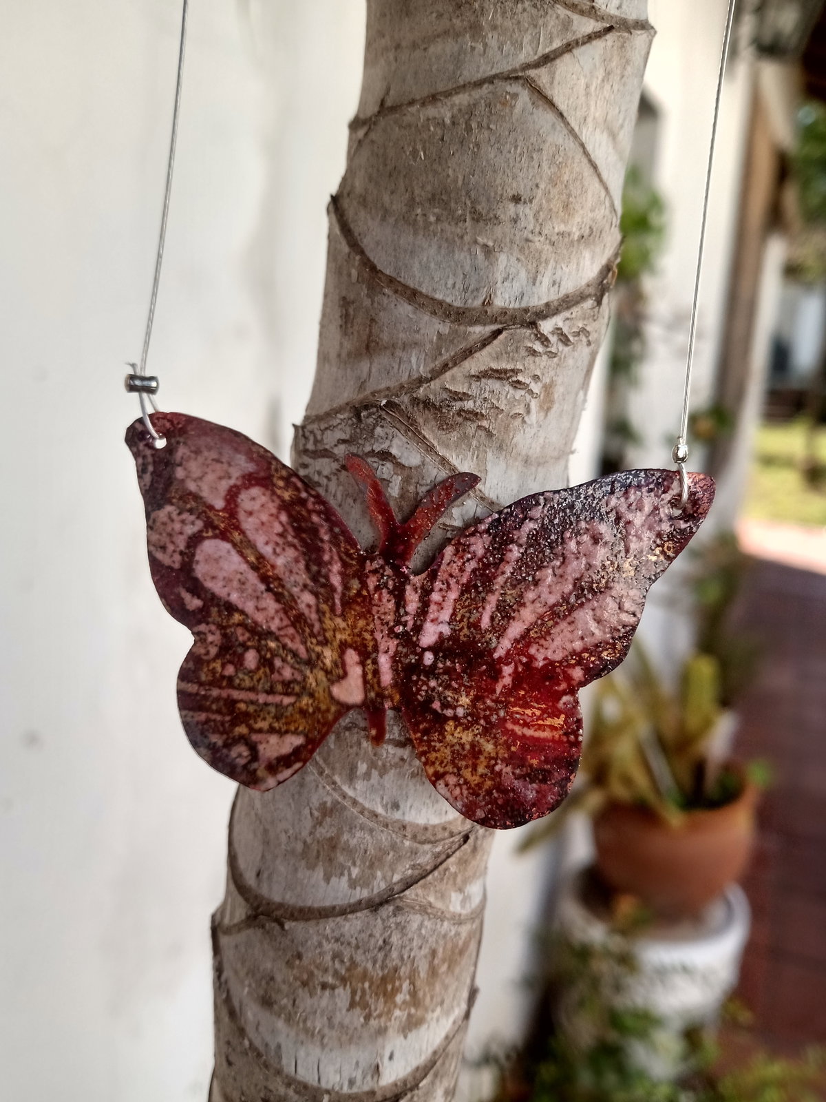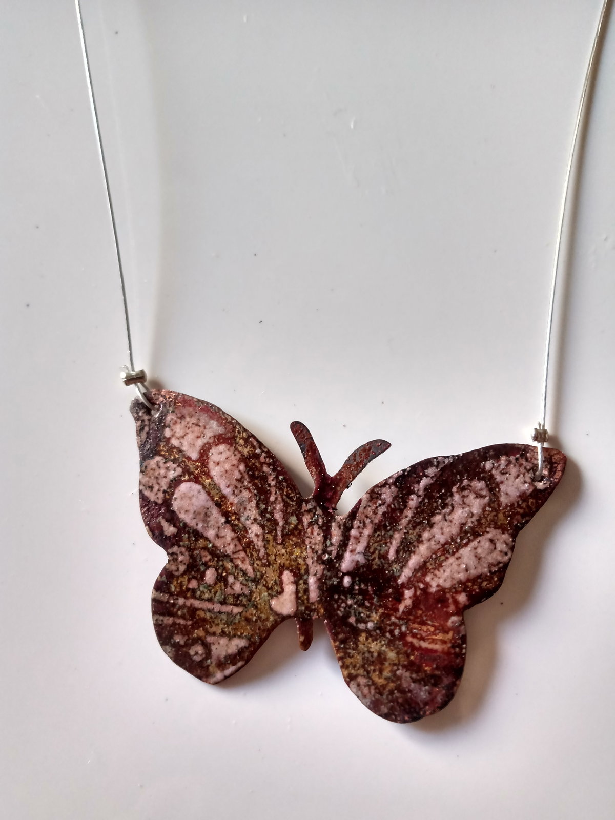 Collar esmaltado a fuego con diseño de mariposa en tonalidades de lila con tanza de acero.