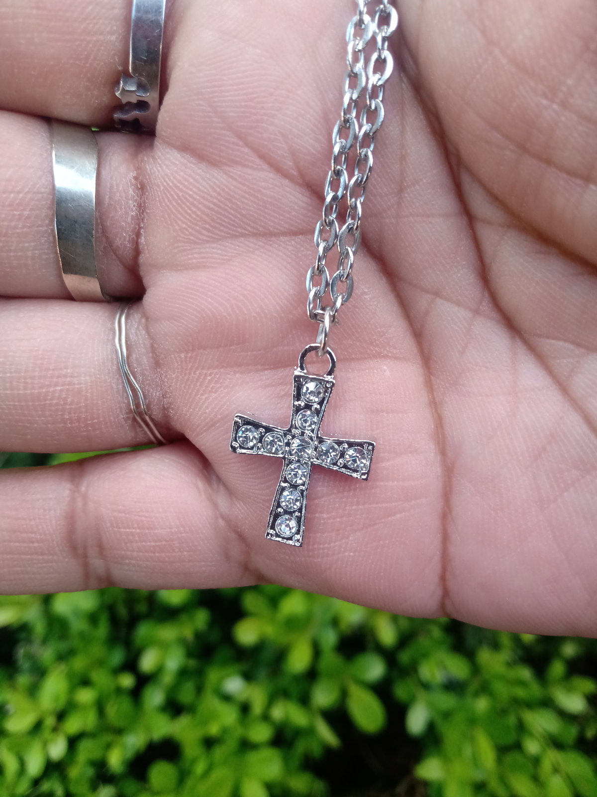 Collar de cadena plateada de acero no quirúrgico de 50 CM con dije cruz estras de níquel