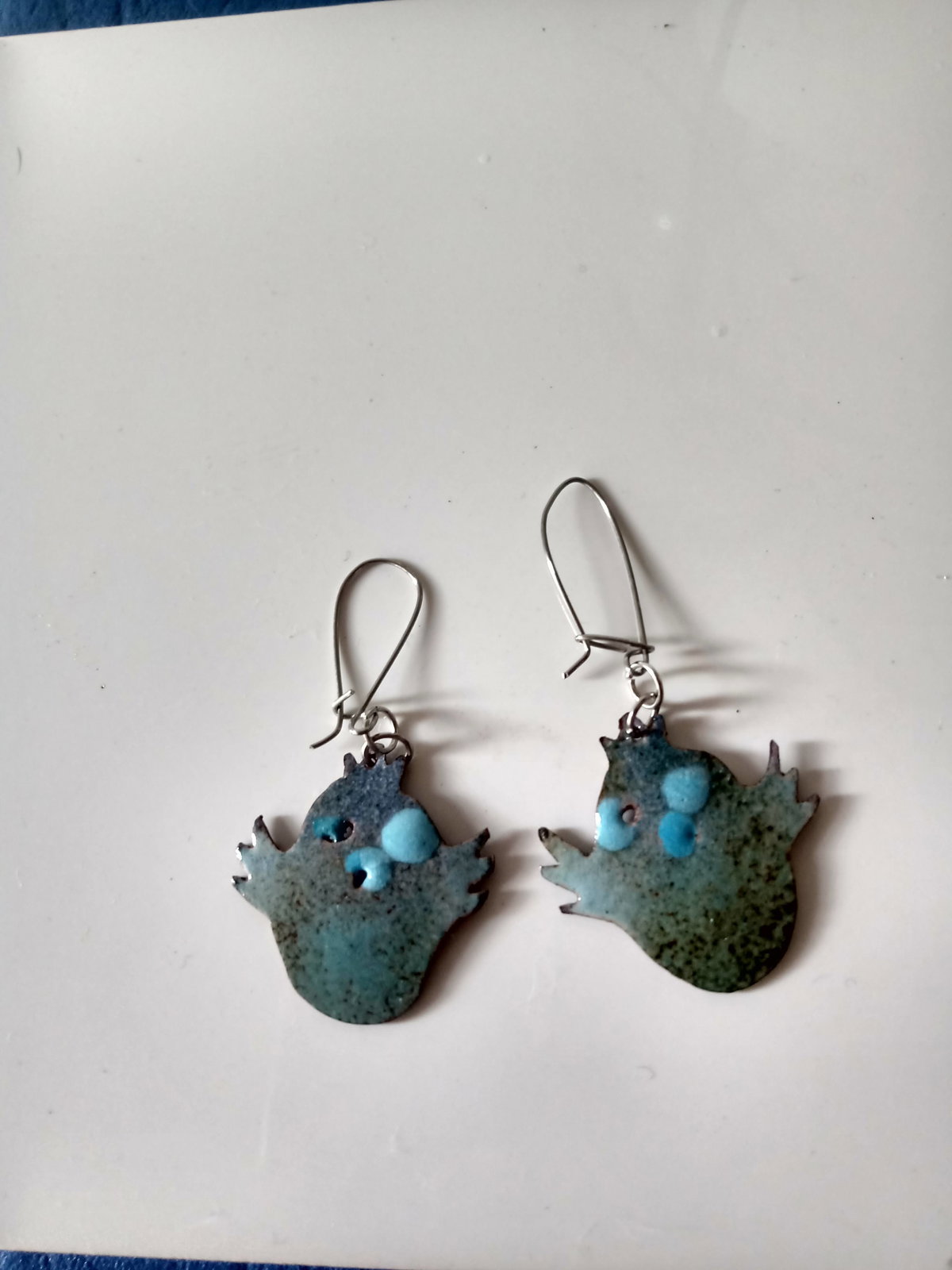 Aros con forma de pollito 🐥de cobre esmaltado a fuego. en tonalidades azules y turquesa pasante de acero quirúrgico.