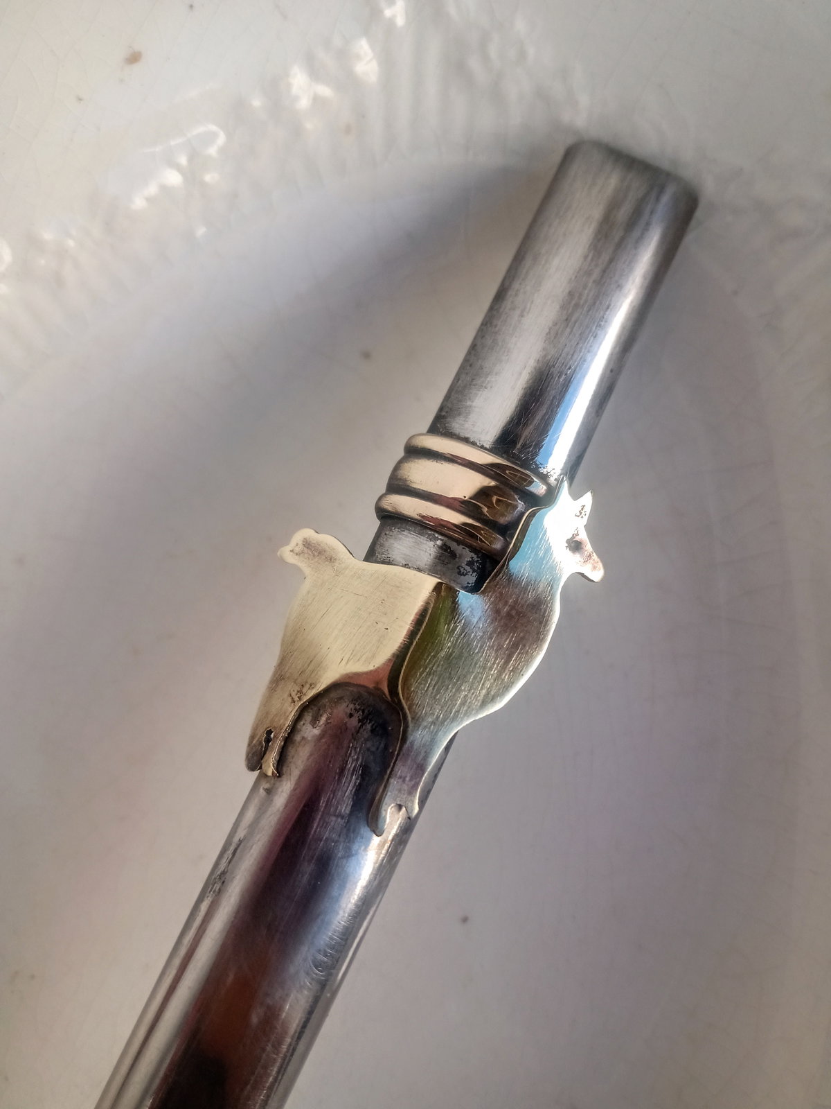 Bombilla con aplique de Alpaca de bronce. Virola de bronce. No se tapa, ni se oxida.