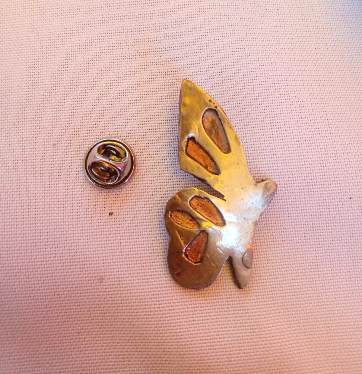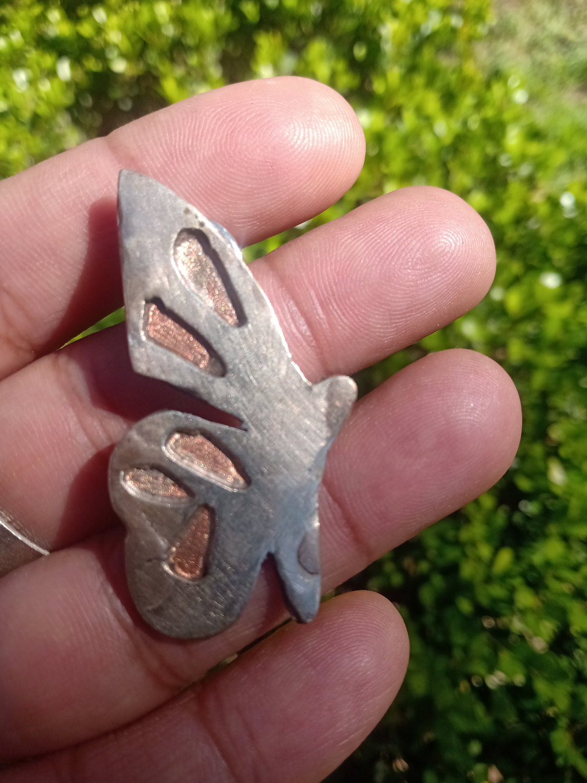 Prendedor mariposa hecha en alpaca y cobre diamantado.