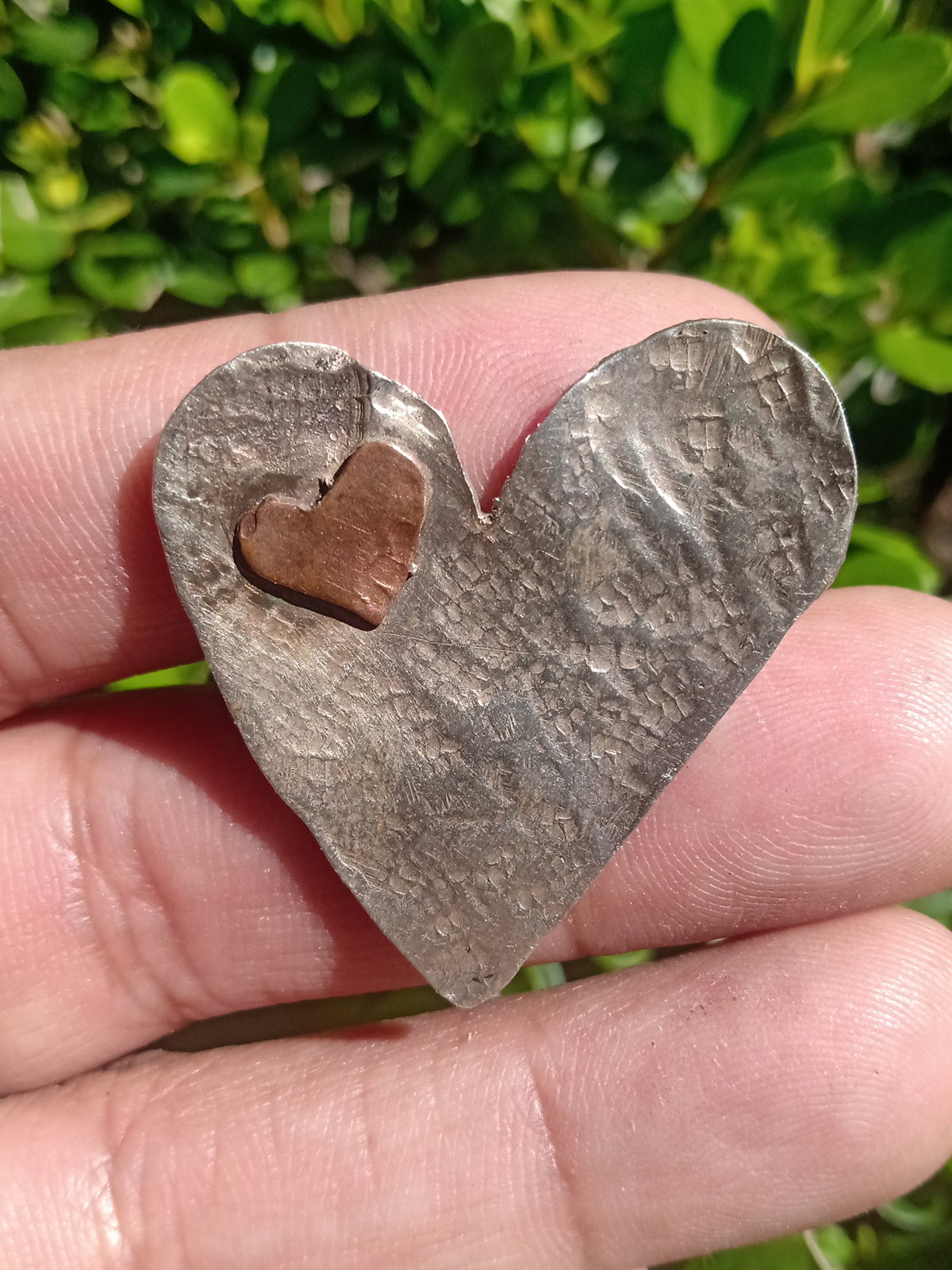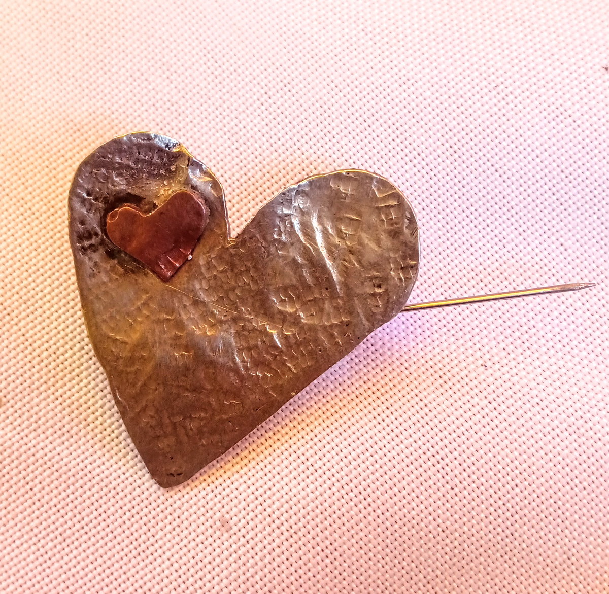 Prendedor corazón hecha en alpaca y cobre. Cincelado a mano.