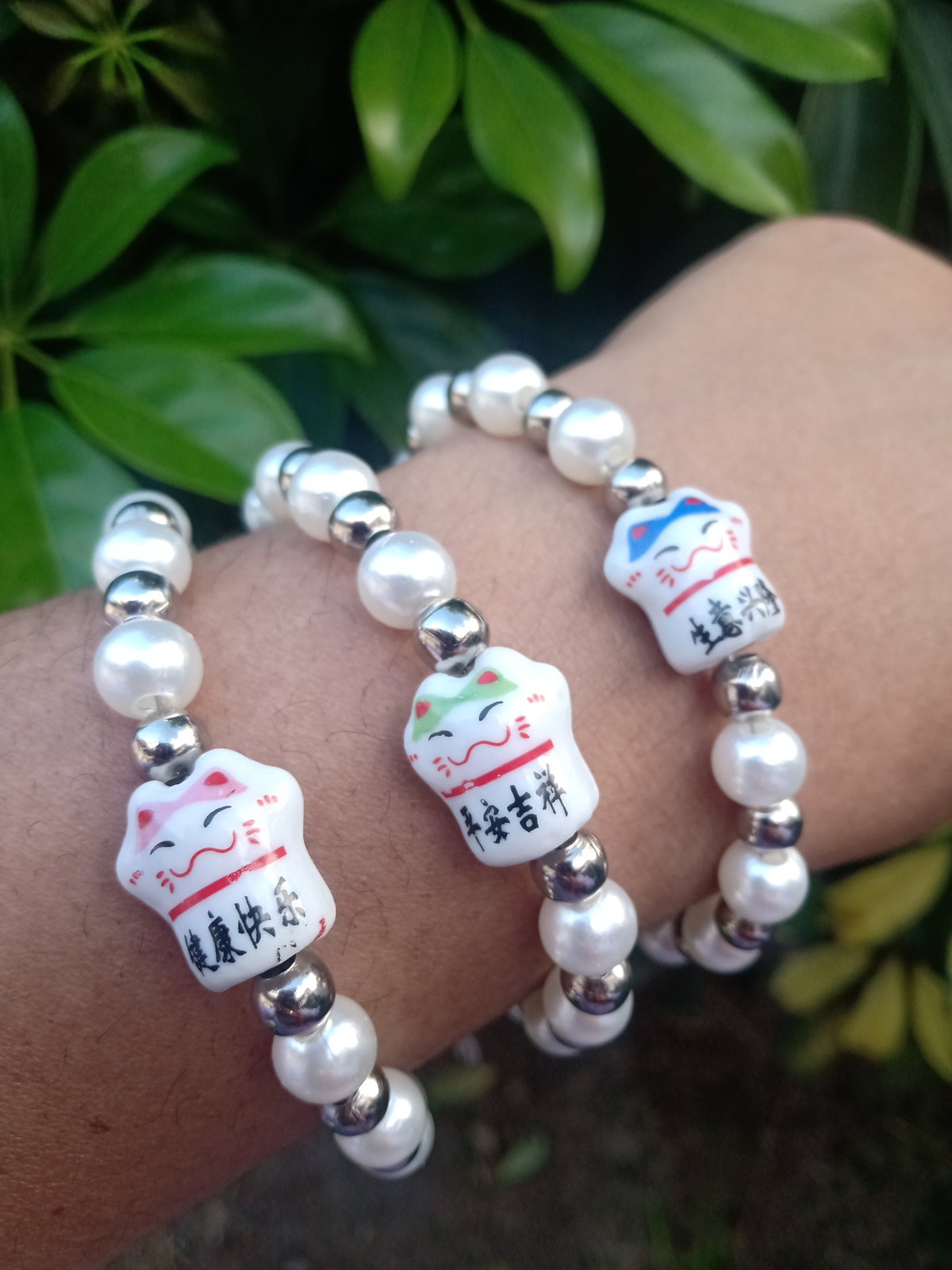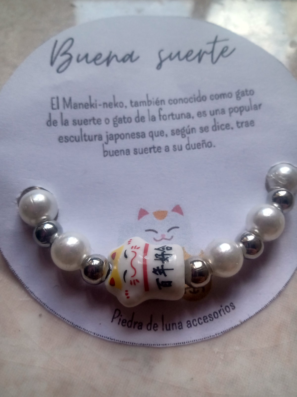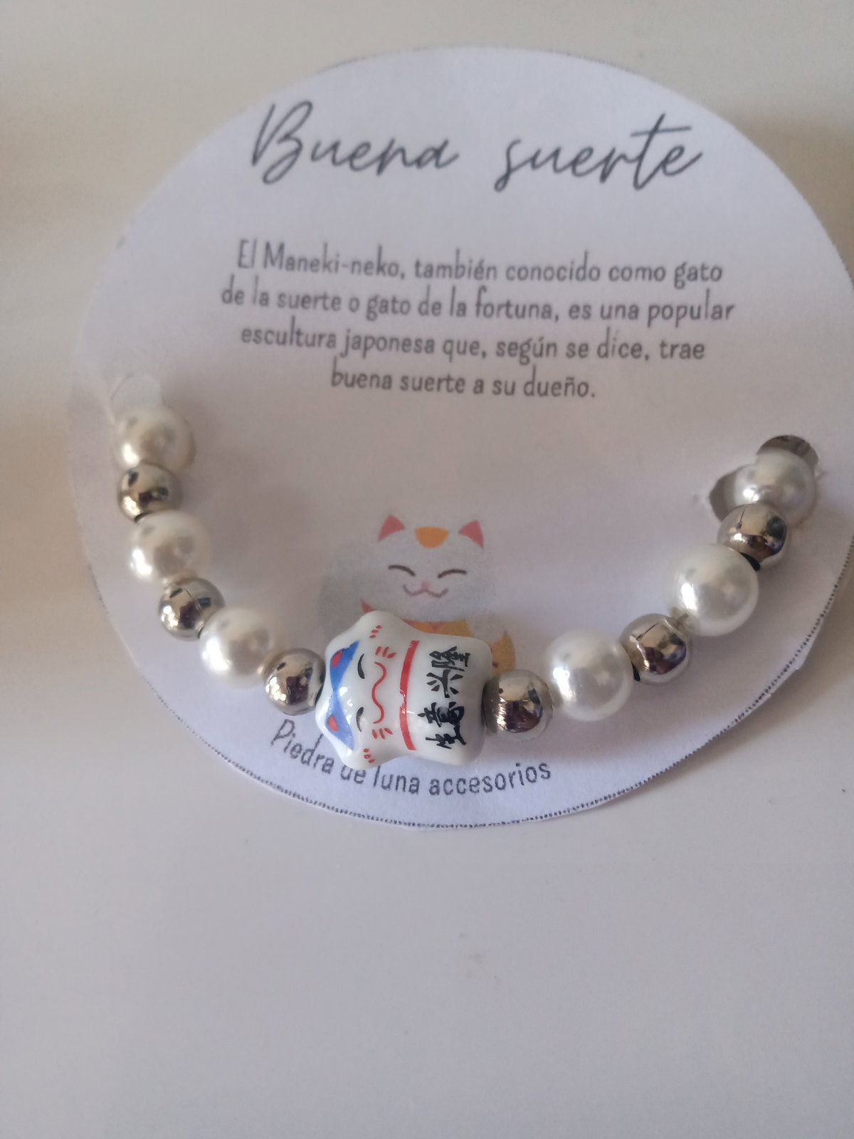 Pulsera enebreda con perlas mostasilla plateado en tanza de acero con gatito Maneki-neko más cadena de extensión de 3 CM aproximadamente.