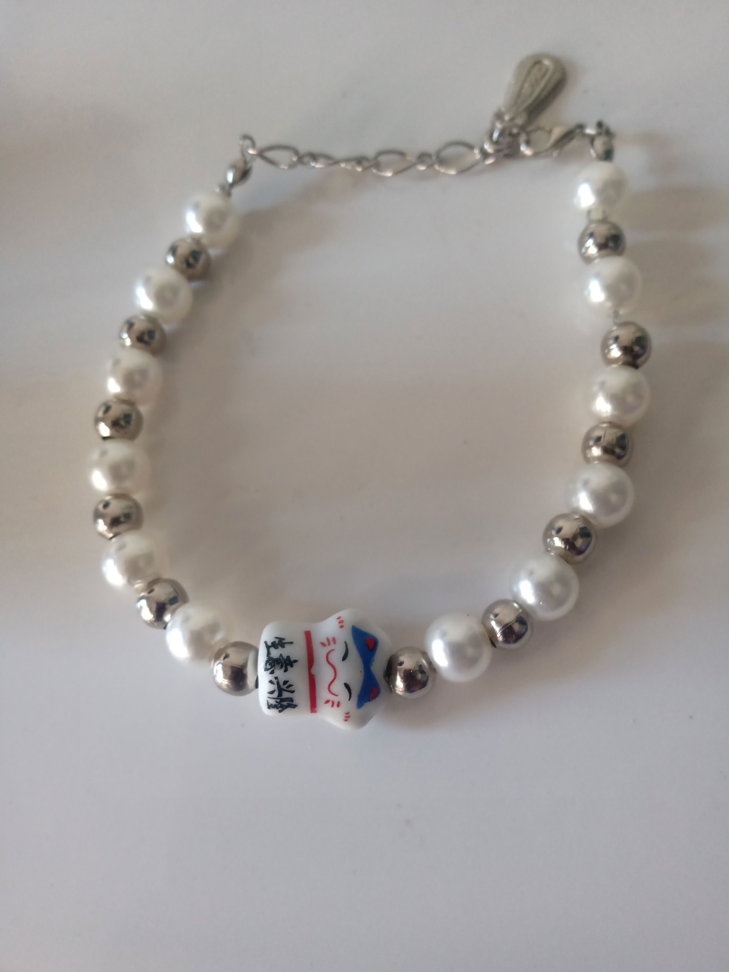 Pulsera enebreda con perlas mostasilla plateado en tanza de acero con gatito Maneki-neko más cadena de extensión de 3 CM aproximadamente.