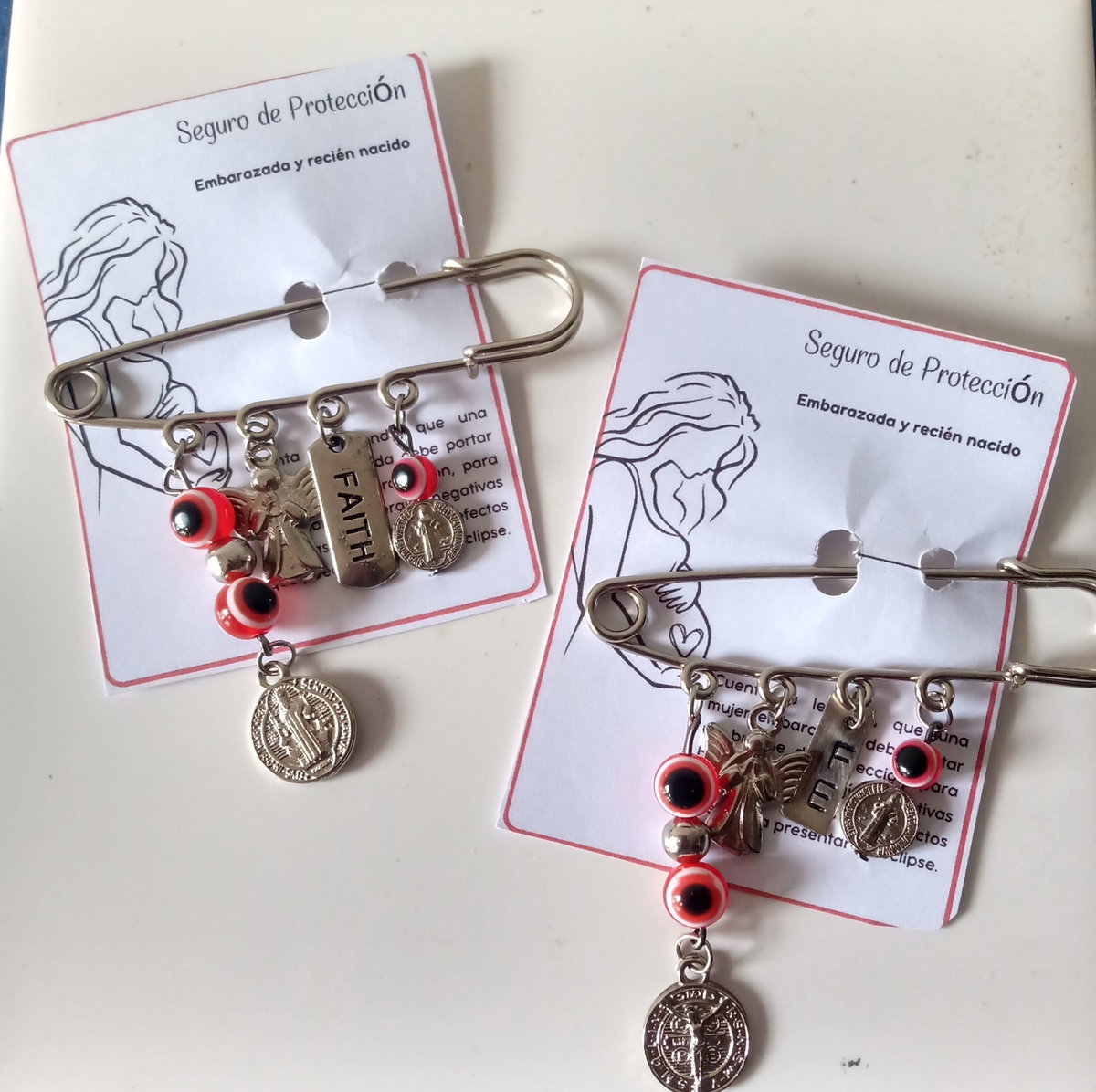 Prendedor con dijes de san Benito , angel de guarda , dije con palabra" fe "y ojo turco rojo para alejar las envidia Gancho alfiler fundición níquel 6 cm aprox.