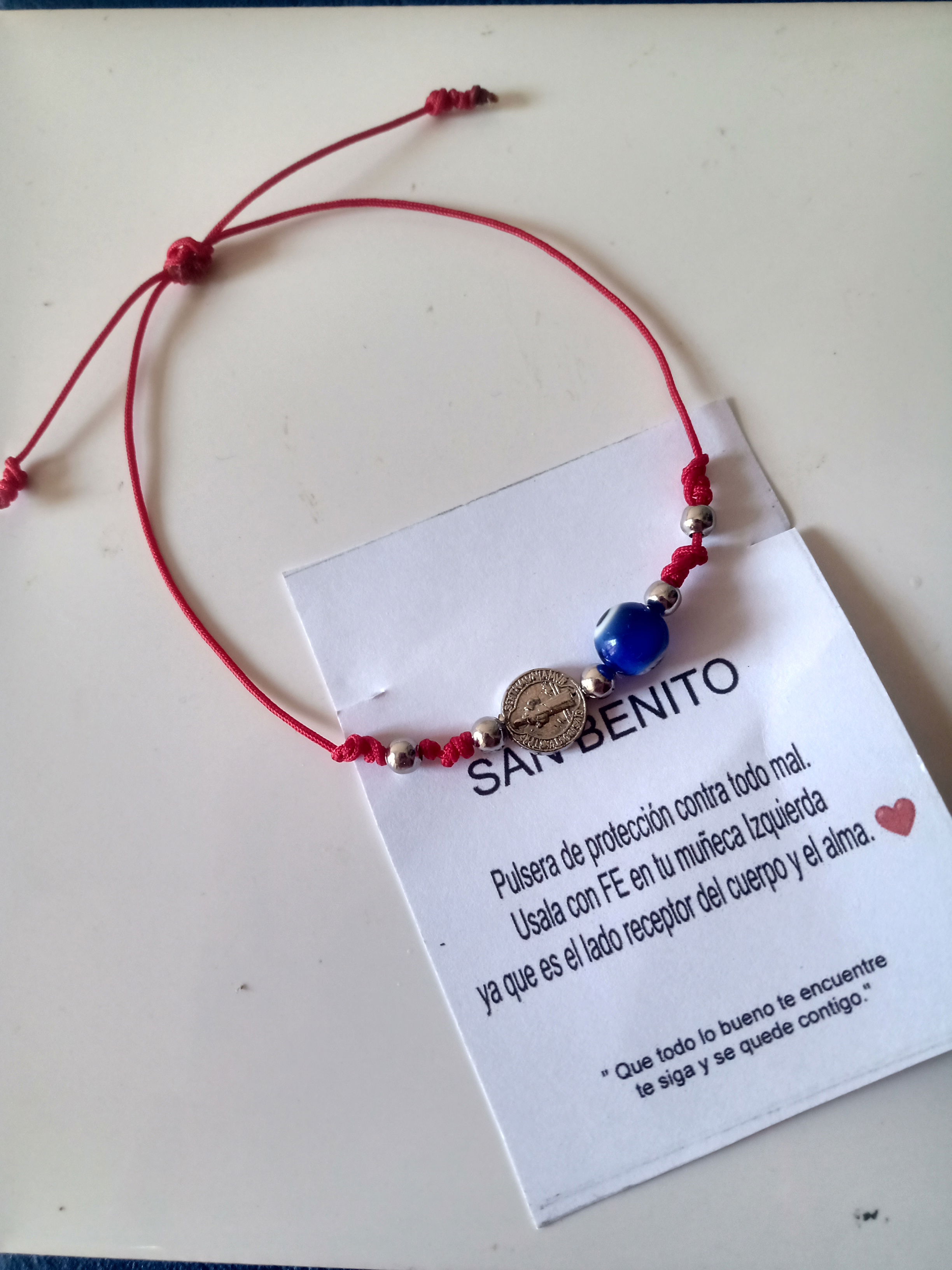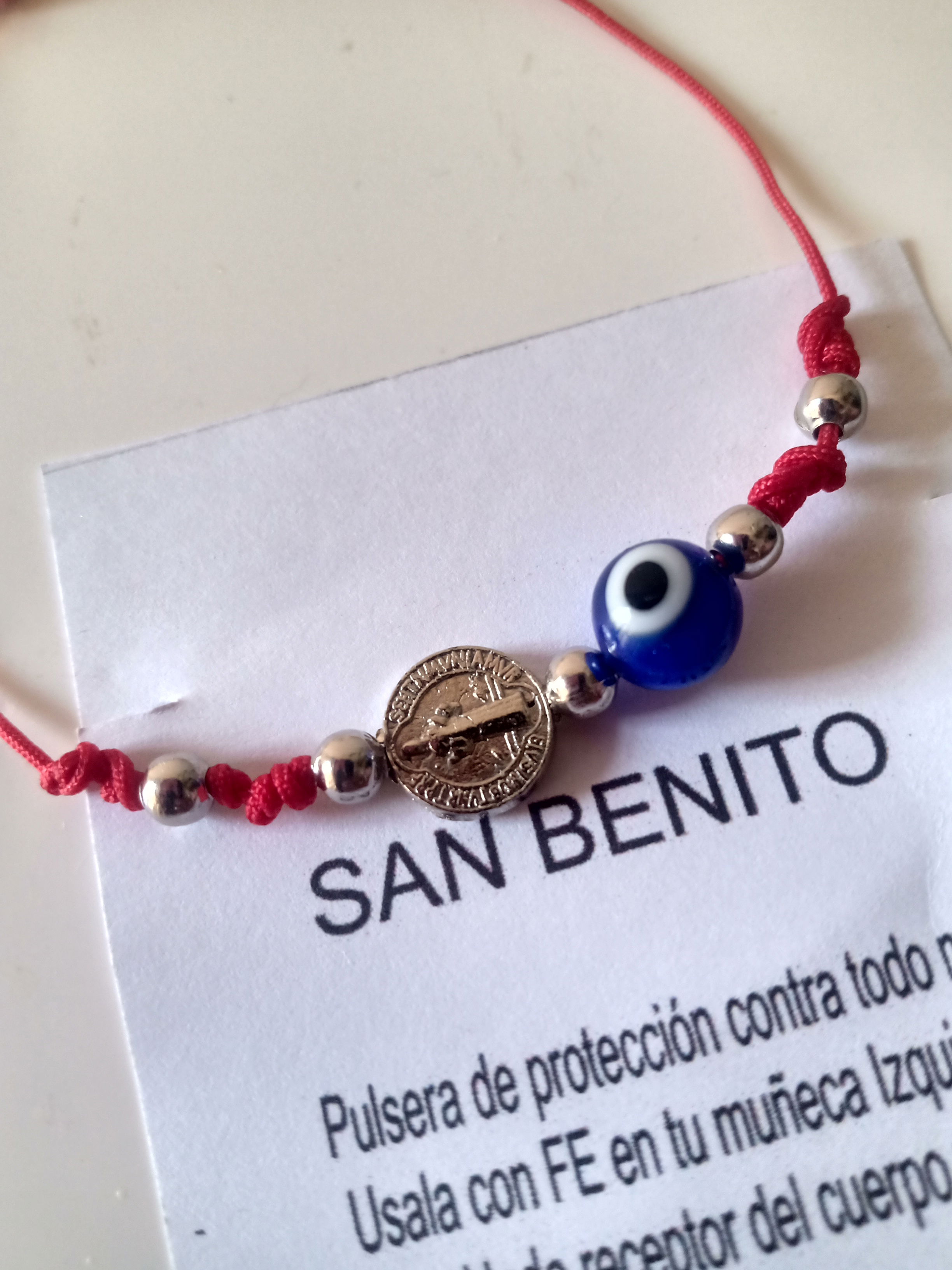 La pulsera de San Benito es un amuleto de protección que combina la fe religiosa de la medalla de San Benito con un símbolo de buena suerte, especialmente en el color rojo. La medalla tiene su origen en la historia del monje San Benito Abad, fundador del monaquismo occidental.