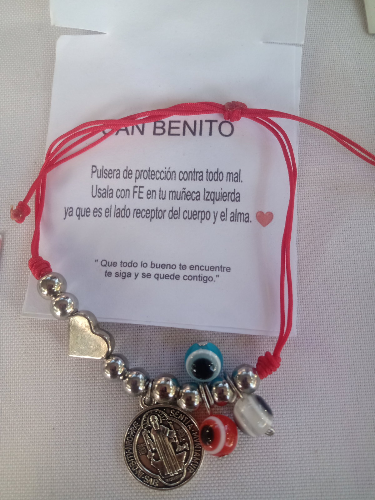 La pulsera de San Benito es un amuleto de protección que combina la fe religiosa de la medalla de San Benito con un símbolo de buena suerte, especialmente en el color rojo. La medalla tiene su origen en la historia del monje San Benito Abad, fundador del monaquismo occidental.