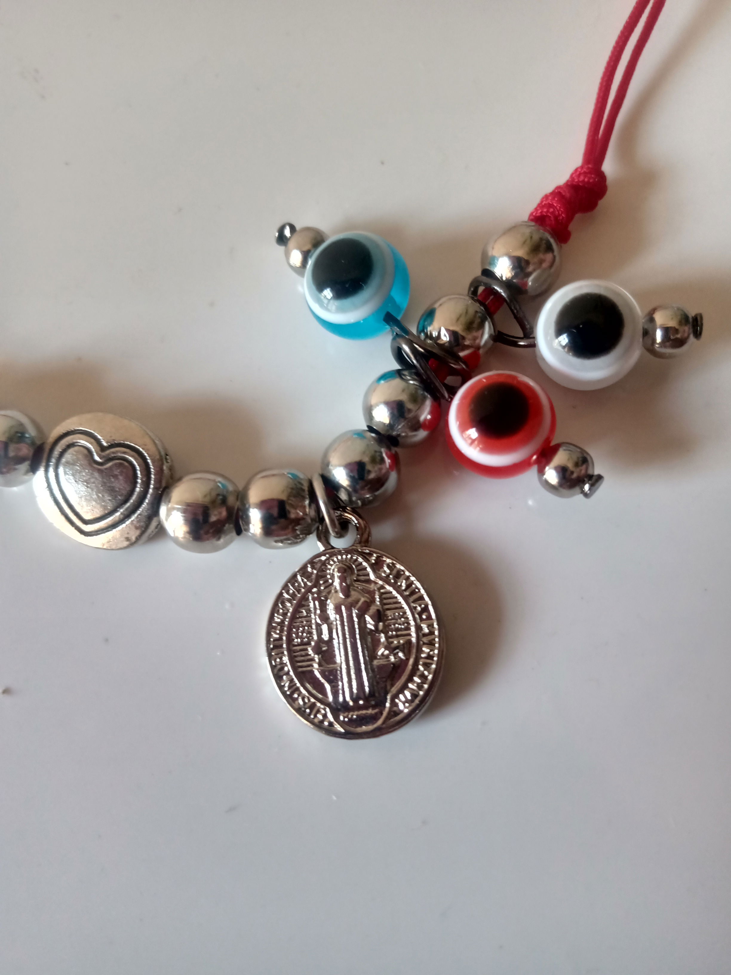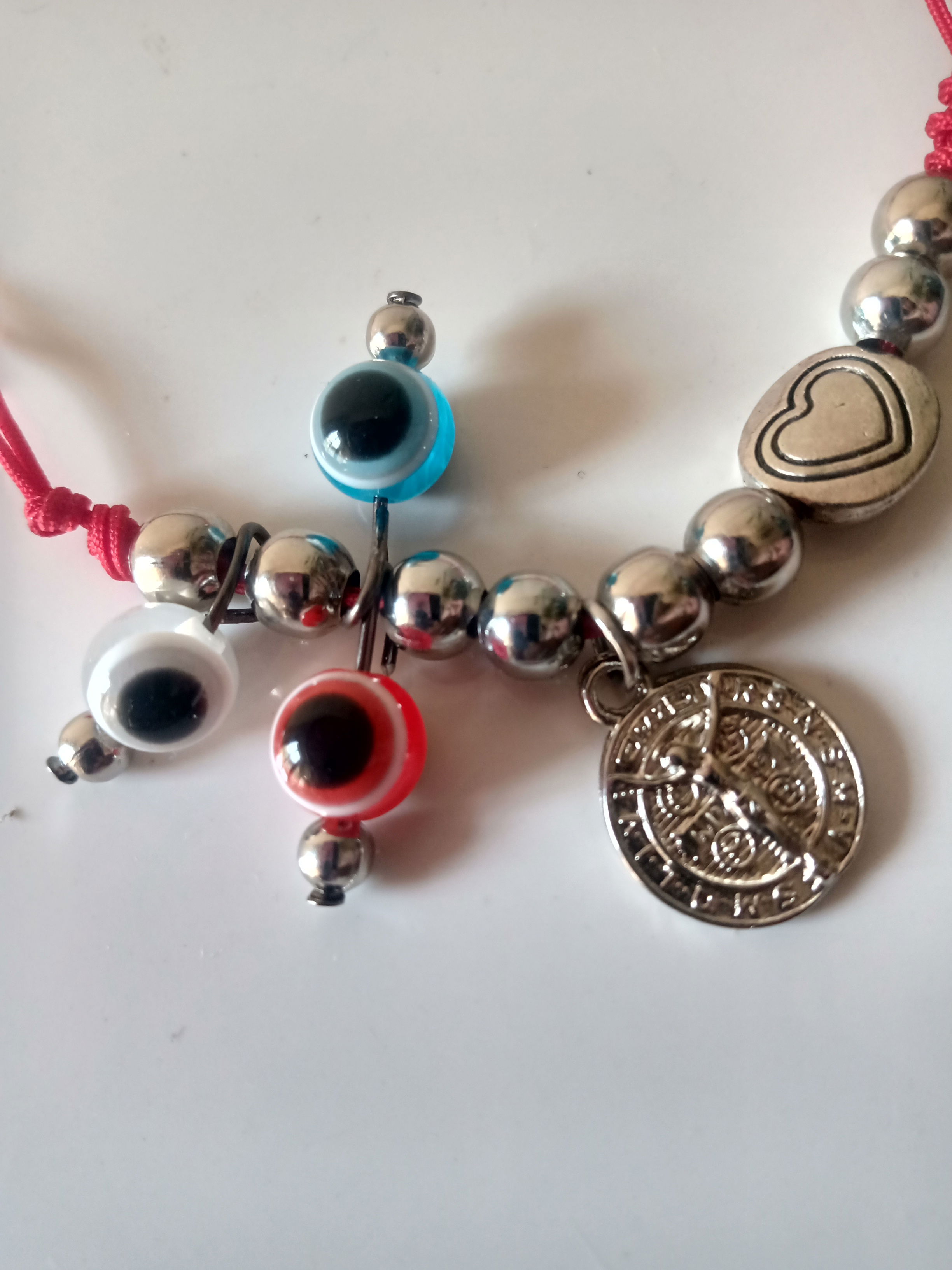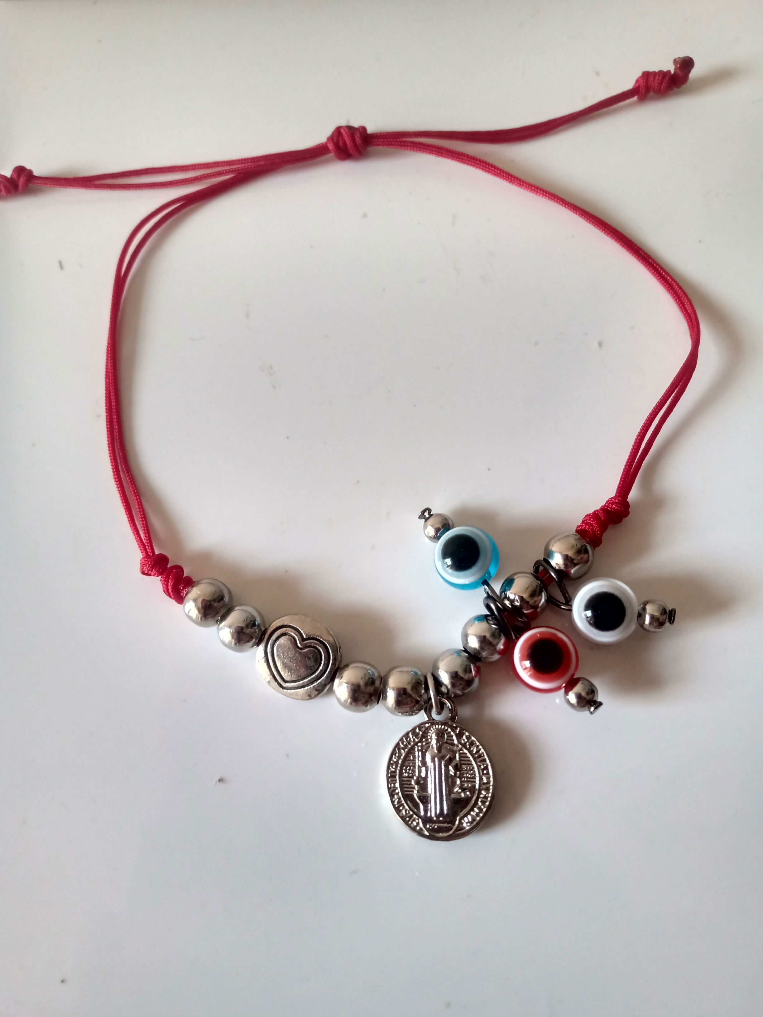 Pulsera de hilo rojo con dije medallón san Benito. Y ojos turcos celeste ,rojo y Blanco.