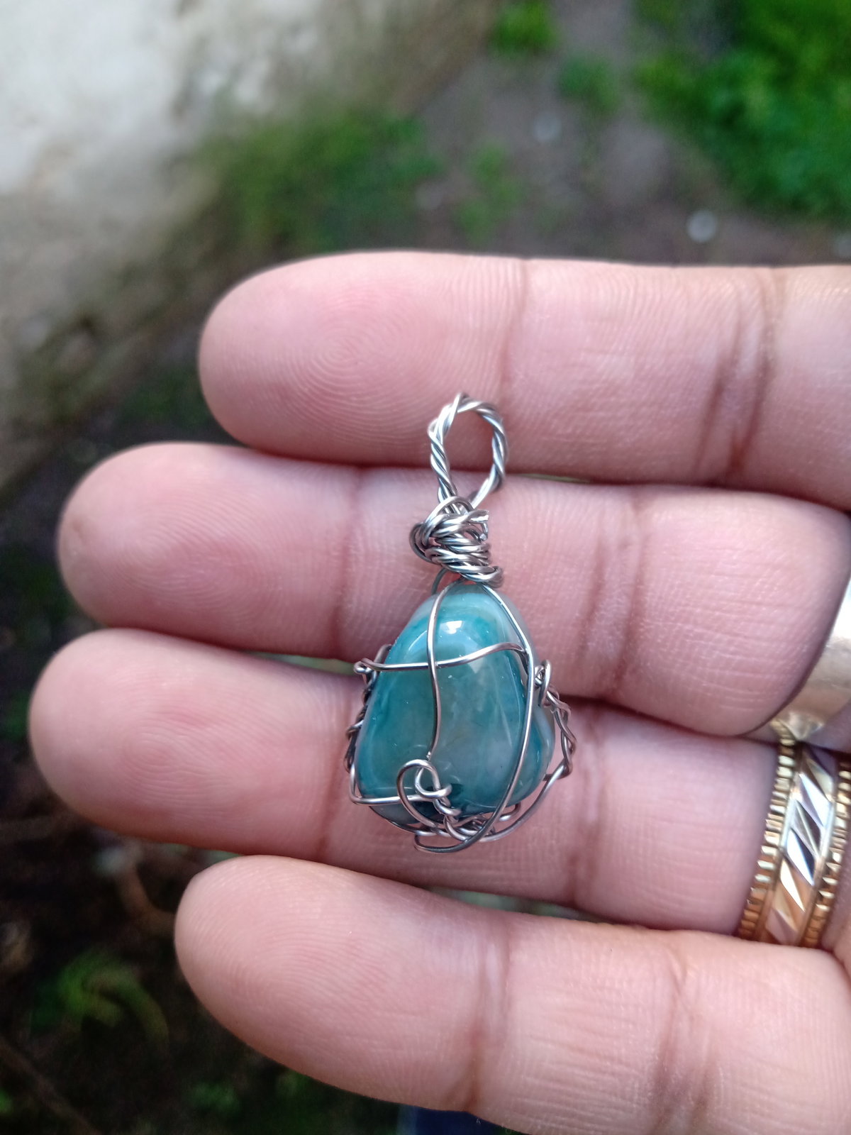 Dije de piedra ágata verde engarzado en alambre de alpaca