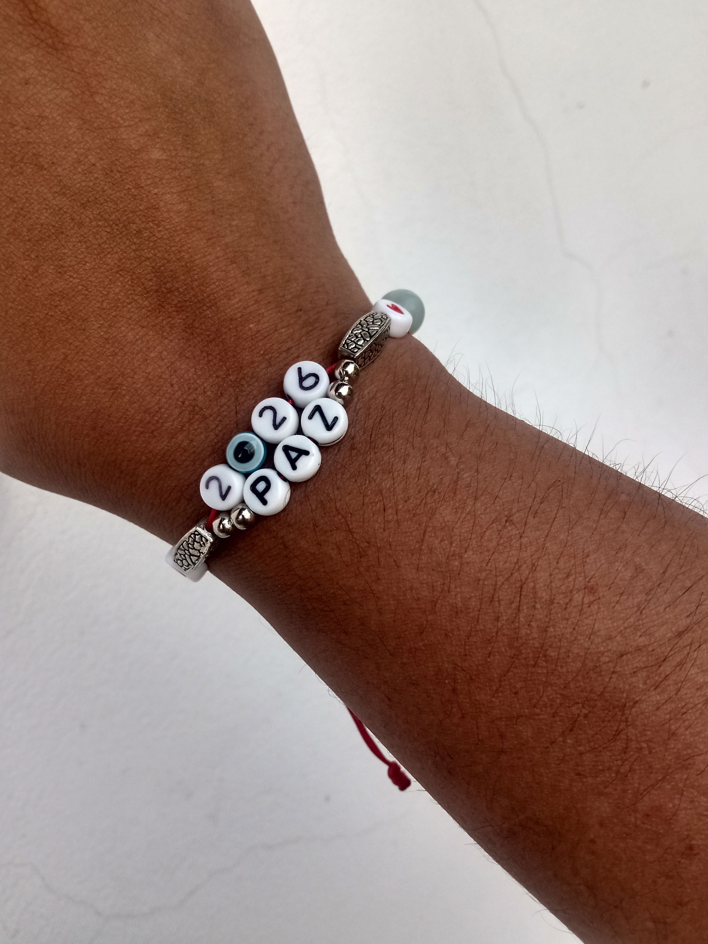 Pulsera de hilo chino rojo con ojo turco celeste y piedra amazonita con palabra m