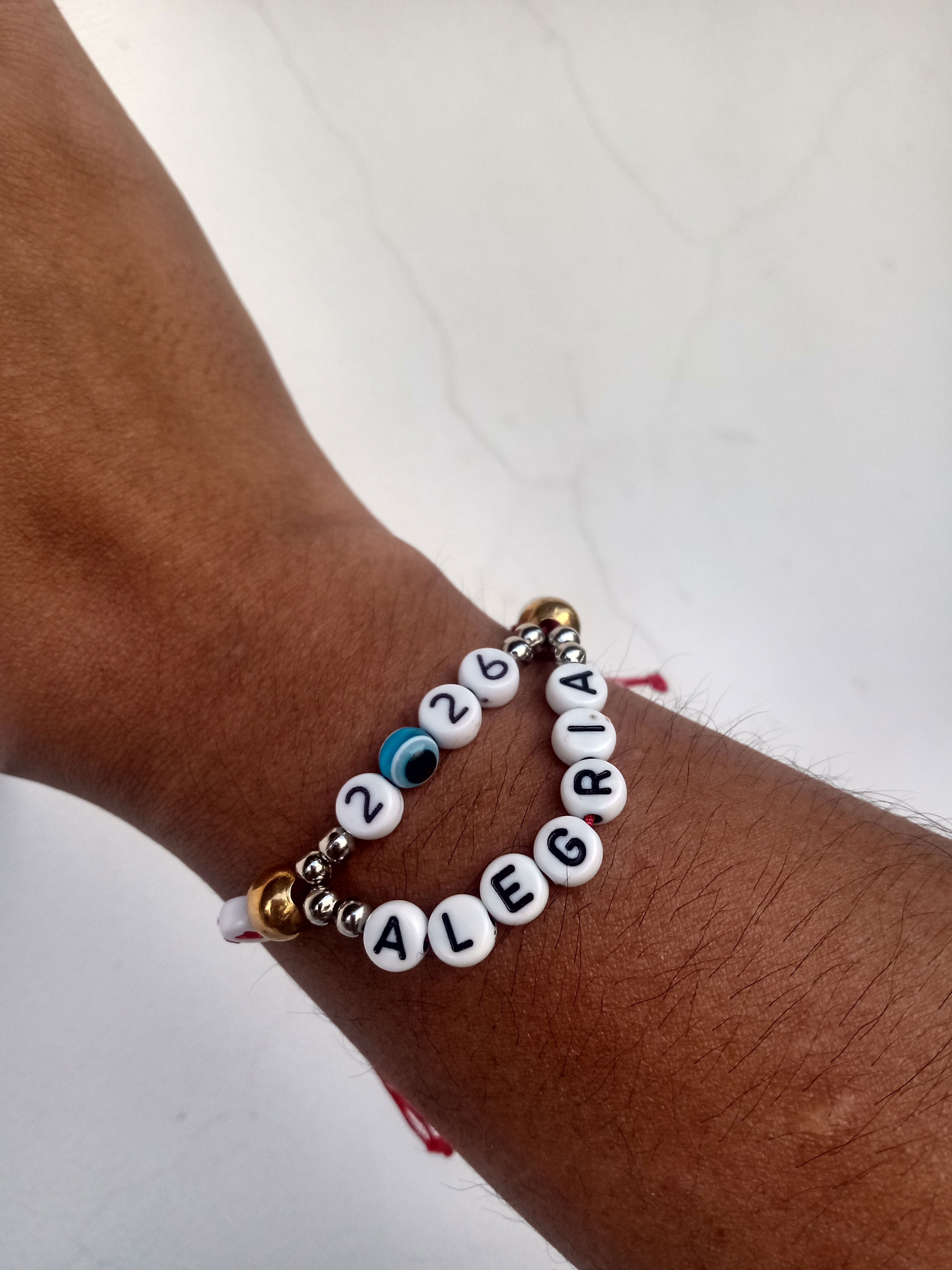 Pulsera de hilo chino rojo con ojo turco  celeste y piedra amazonita  con palabra m