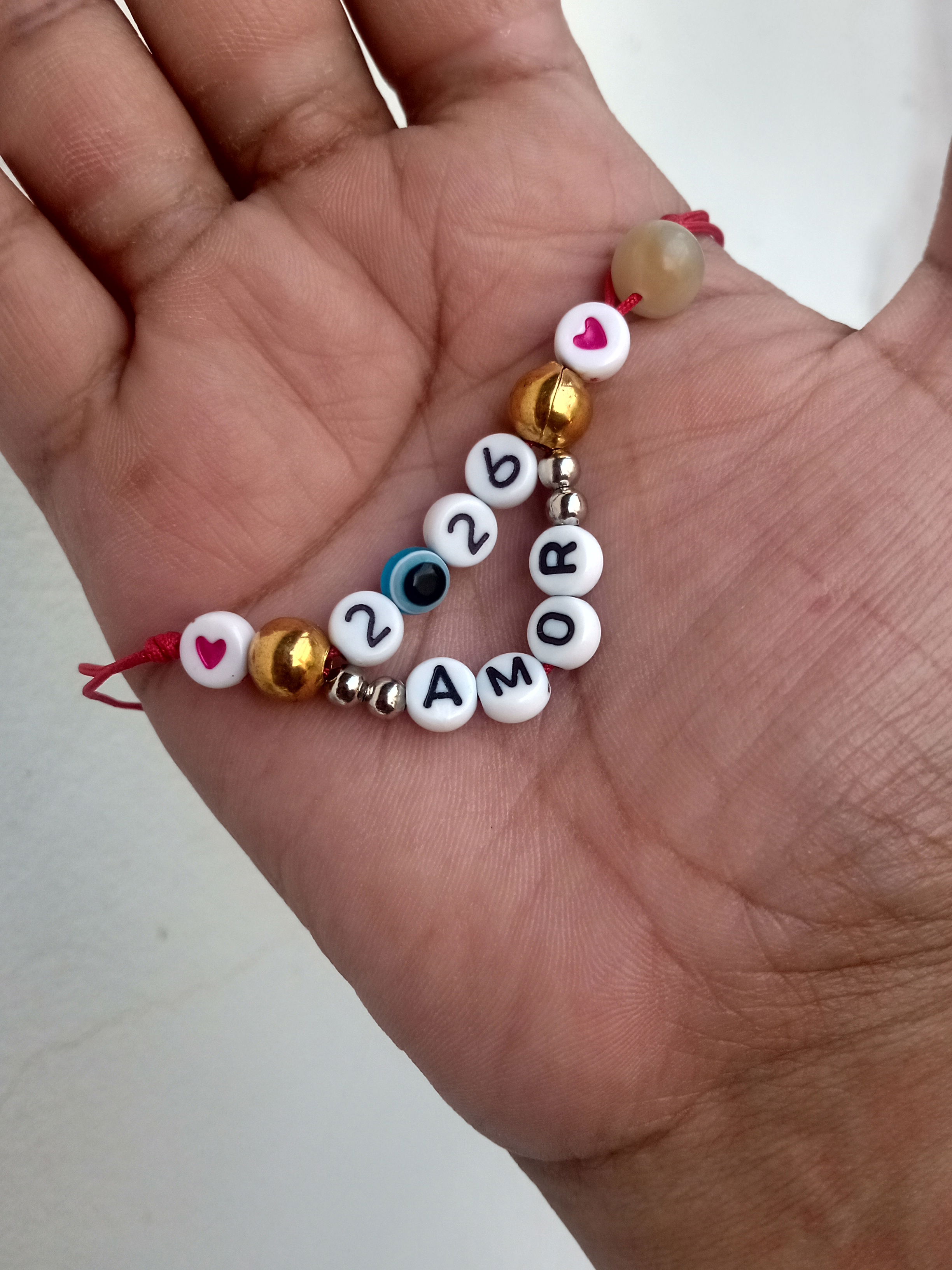 Pulsera de hilo chino rojo con ojo turco  celeste y piedra amazonita  con palabra m