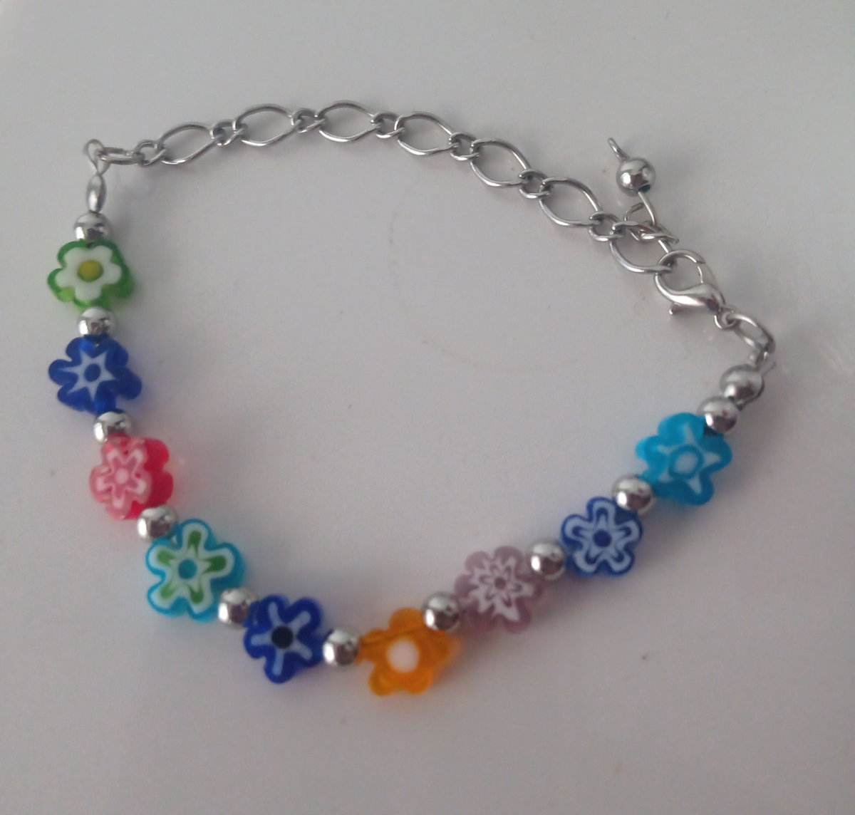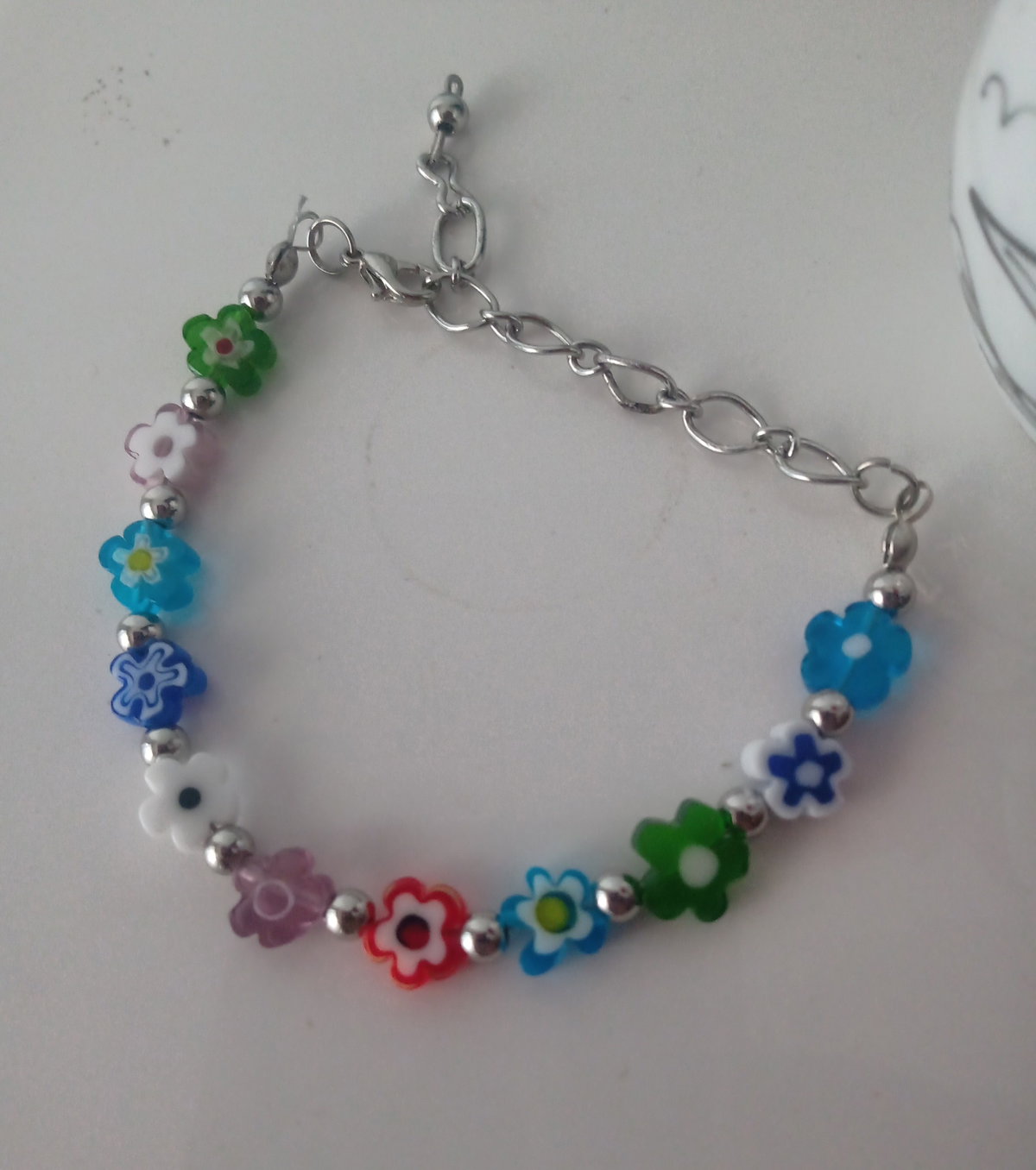 Pulsera enebrados en tanza de acero con mostasillas de flores de colores Con extensión de cadena de aprox 2 cm