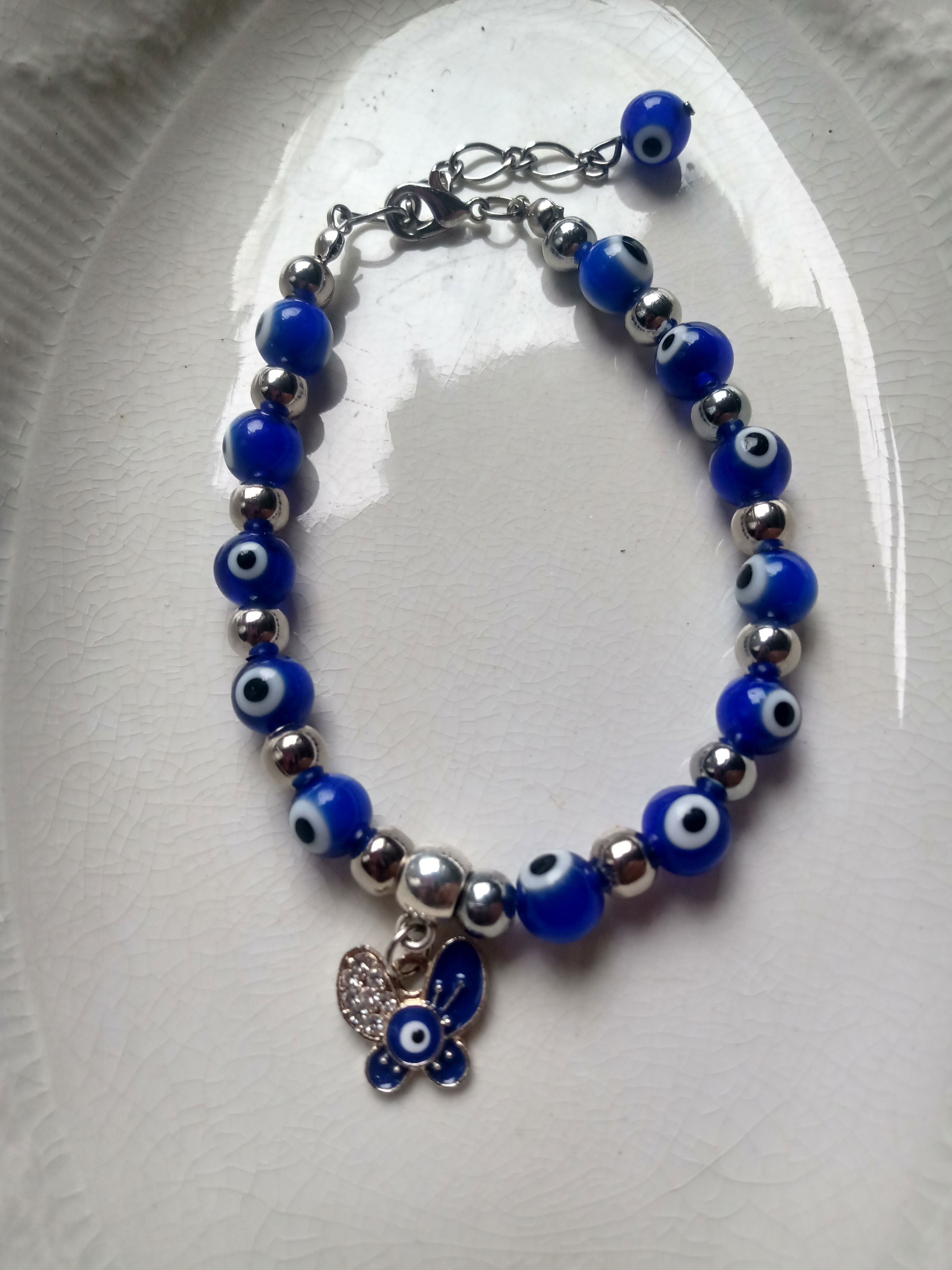 Pulsera enebrados en tanza de acero con mostasillas de ojos turcos azules con dije mariposa atrás con ojo tuco azul.