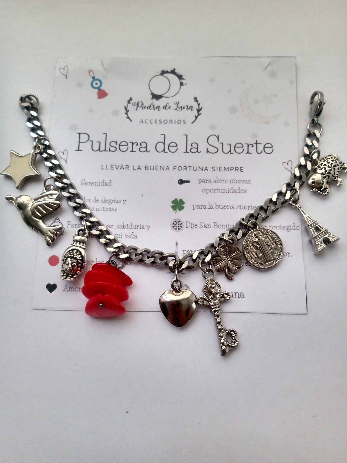 Pulsera de acero quirúrgico con dijes de fundición. Para tener siempre buena suerte.