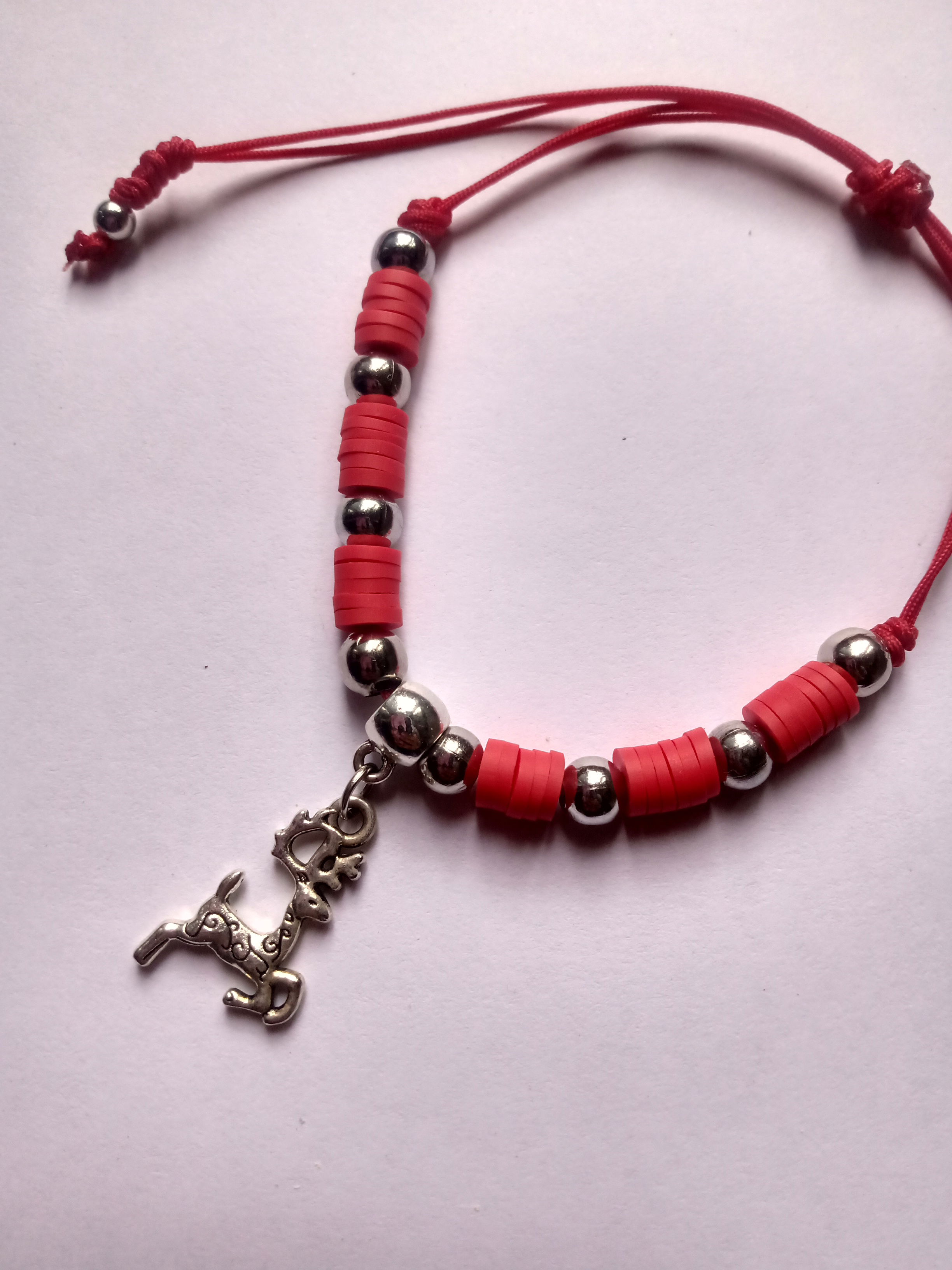 Pulsera de hilo rojo chico con mostasillas de fimo rojo y plateado. Con dije reno.