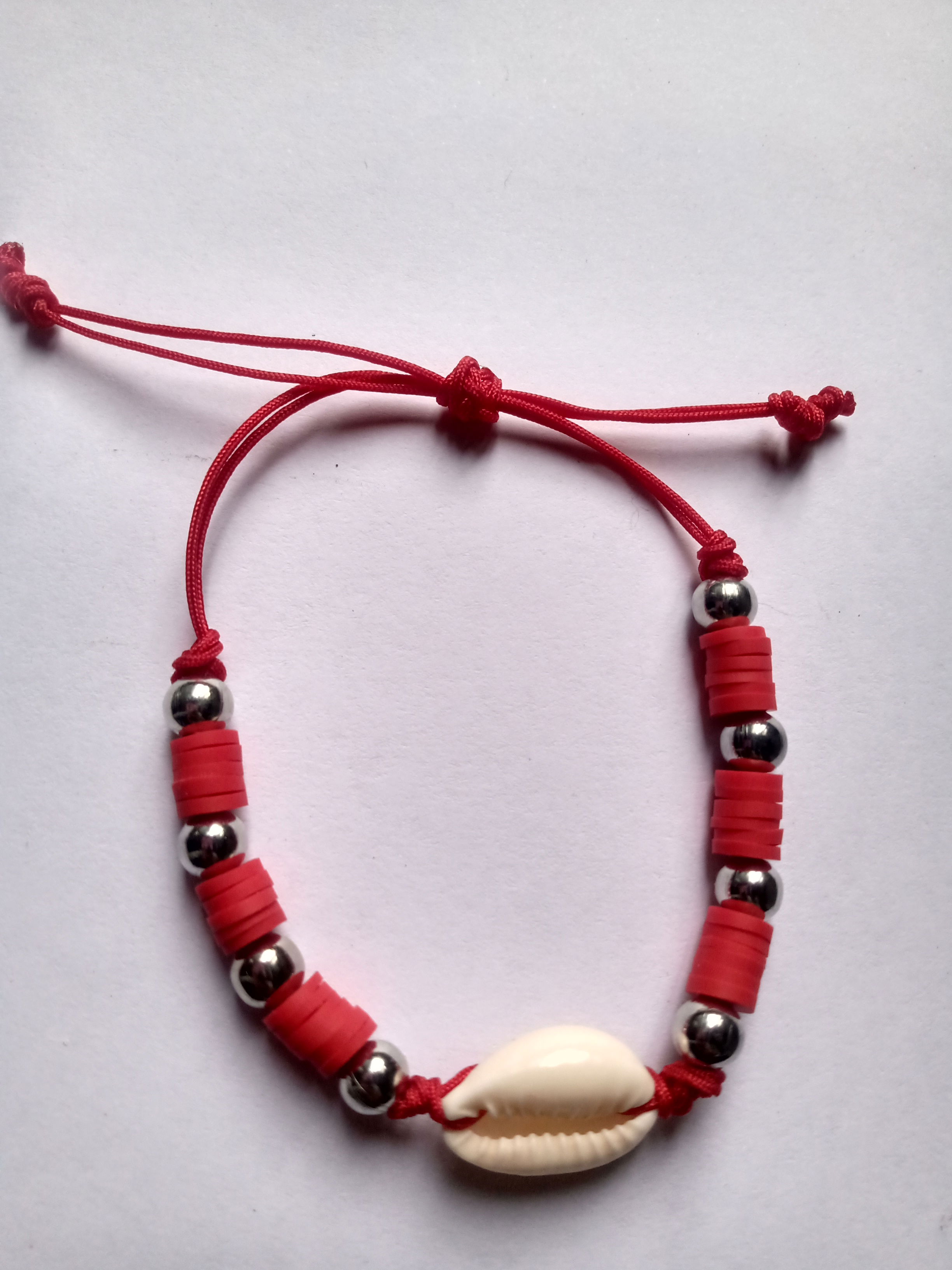 Pulsera de caracoles naturales con hilo chino y mostasillas de fimo rojo y mostasillas plateadas.