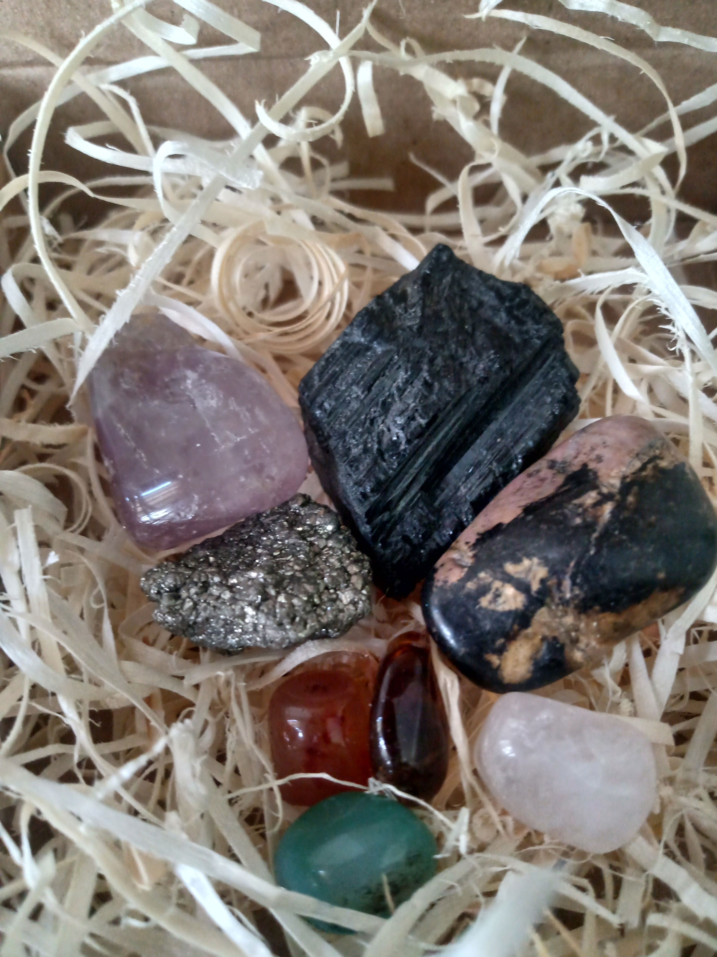 Kit piedras para la ambuncia, protección, ansiedad y amor , incluye amatista, pirita, cornalina, rodonita, turmalina, citrino y cuarzo verde.