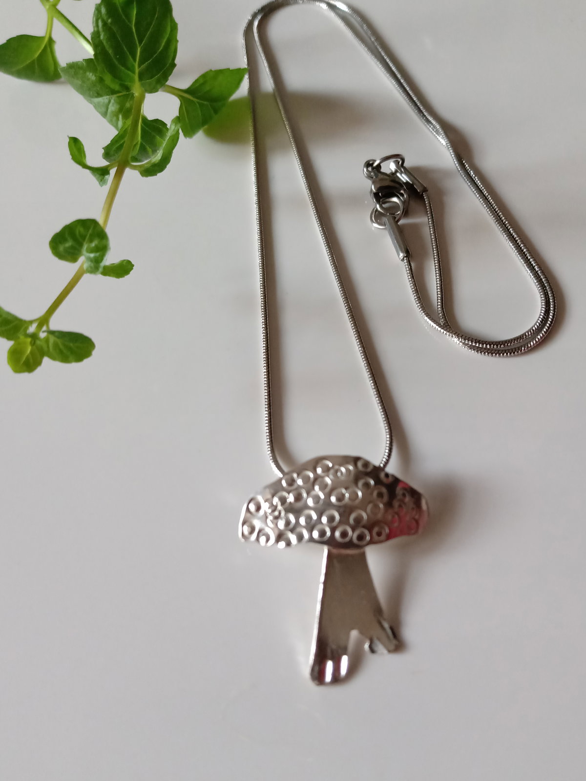 Collar hongo cincelado a mano y hecho 100 % a mano en plata 925. Incluye cadena de acero quirúrgico .