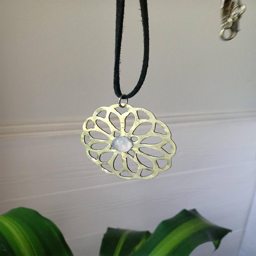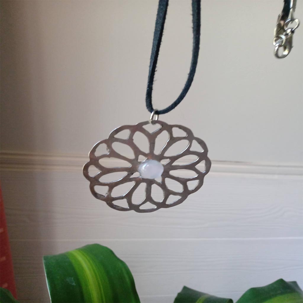 collar con dije mándala calada a mano con una pequeña piedra de cuarzo rosa. cordón de gamuza negro de 45 cm