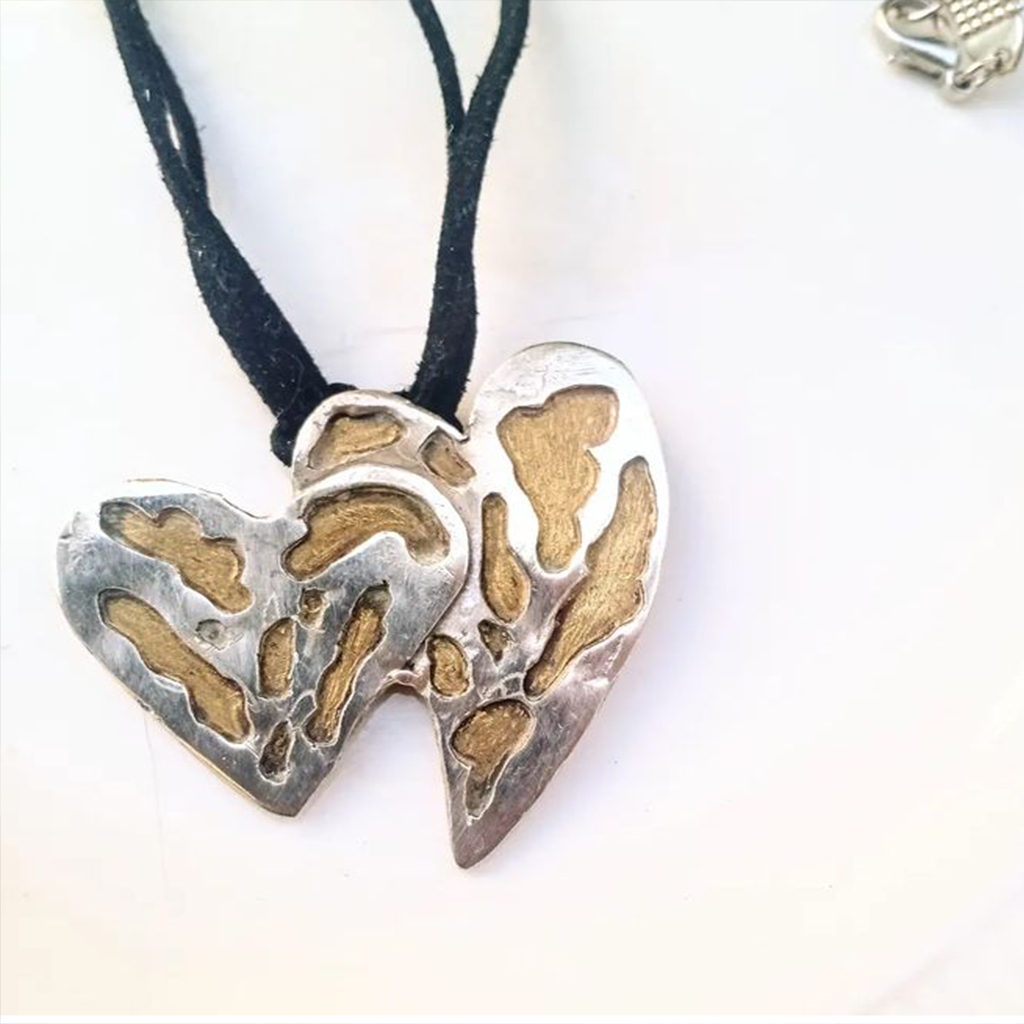 Collar dos corazones en alpaca y bronce diamantado . con cordón de gamuza negro de 45 cm