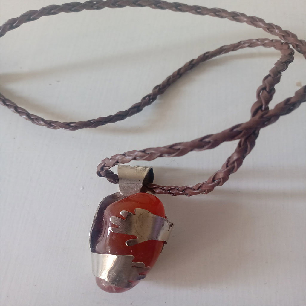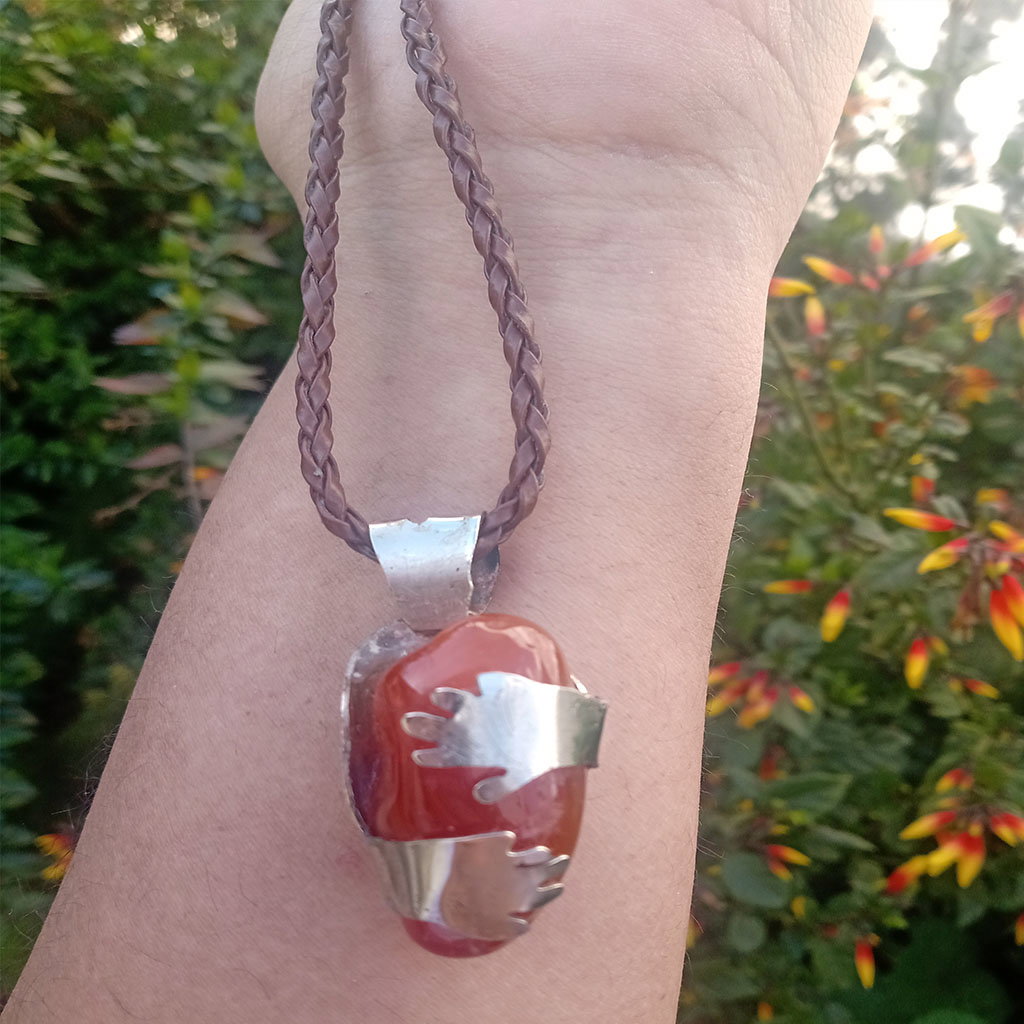 Collar con dije alpaca y piedra cornalina. cordón de cuero marrón de 50 cm. El ágata cornalina, con su vibrante energía, te acompaña en cada paso y el diseño de engarce abrazo simboliza ese cariño, apoyo constante y amor propio 💖💫