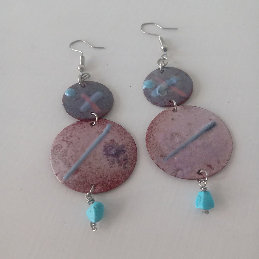 Aros hecho en cobre esmaltados a fuego con pequeña piedrita turquesa. pasantes de acero quirúrgico