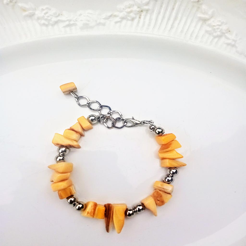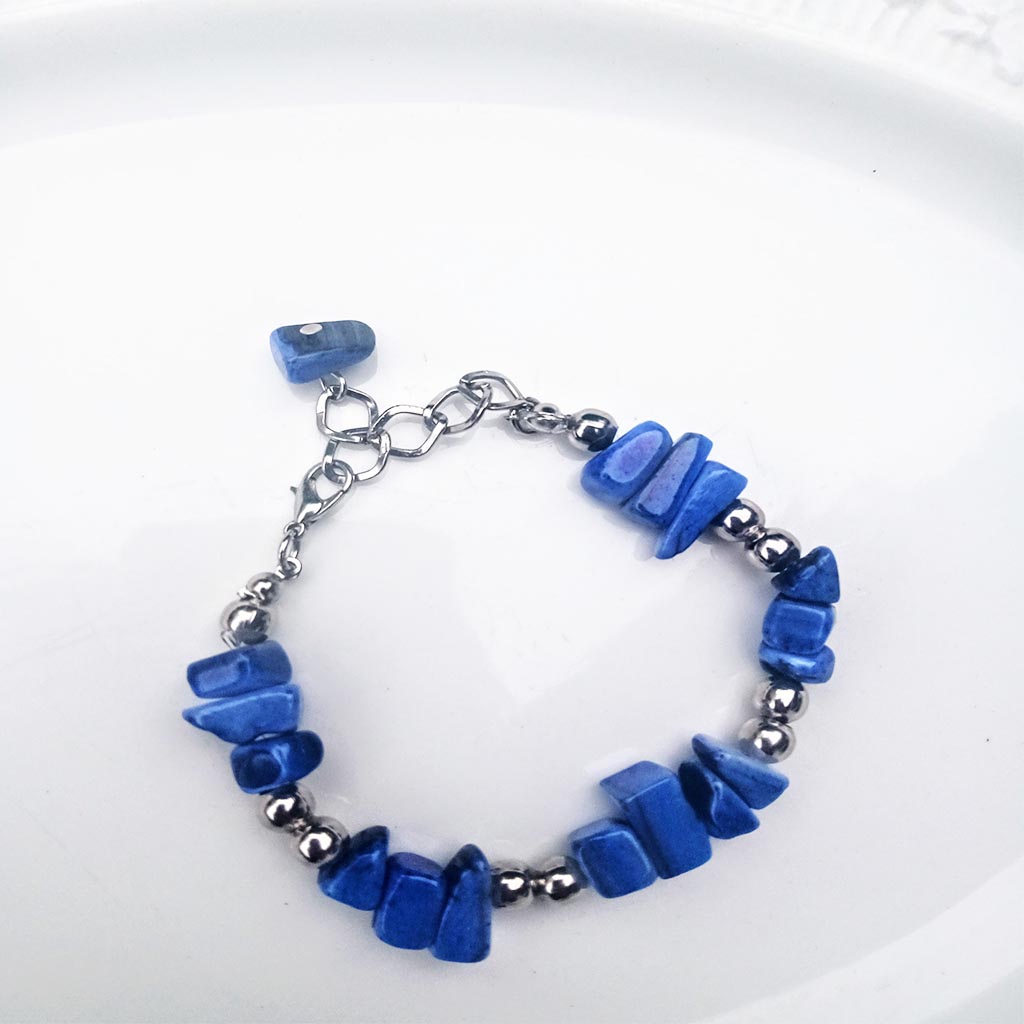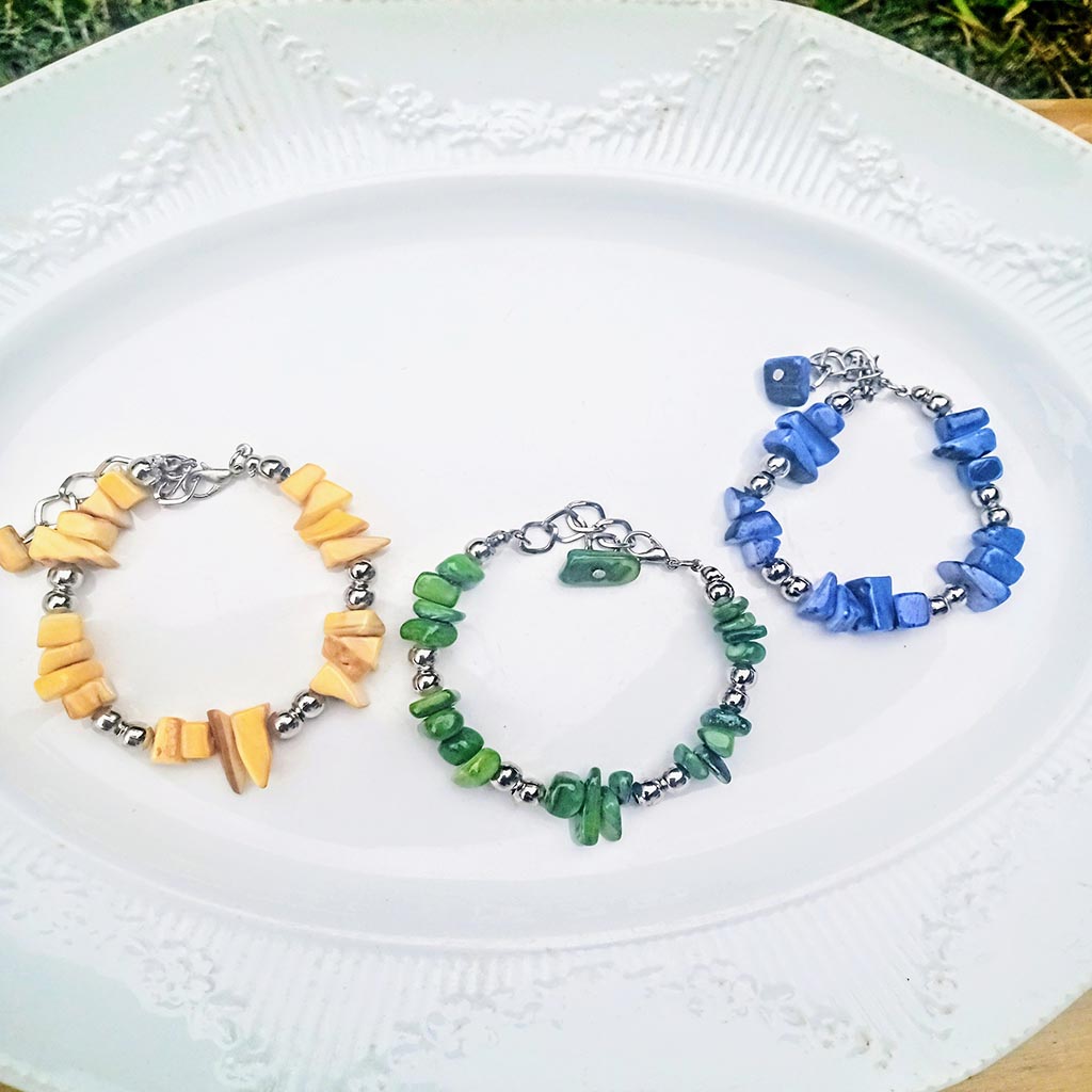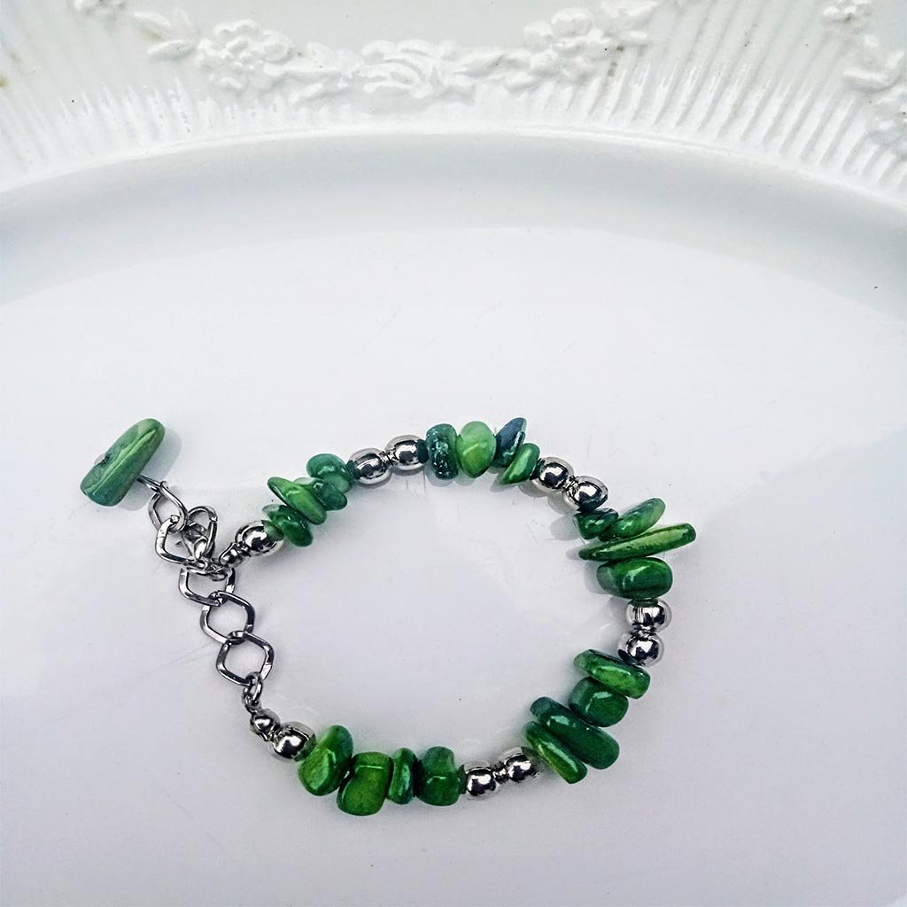 Pulsera de cuantas nácar enhebradas en taza dura con terminaciones de acero no quirúrgico .