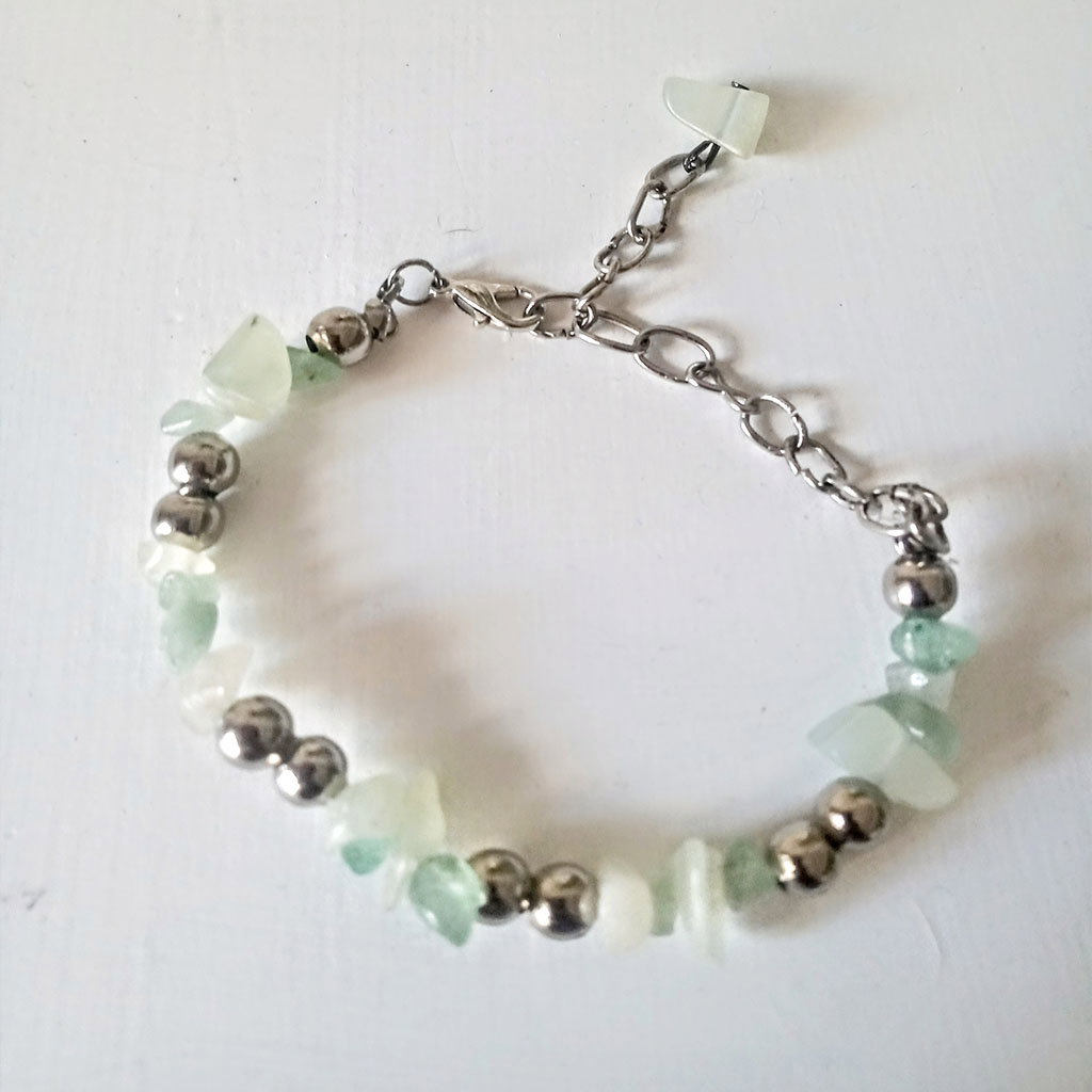 Pulsera de escallas de piedra natural cuarzo verde enhebradas en tanza dura con terminaciones de níquel. Cierre mosquetón del mismo metal.