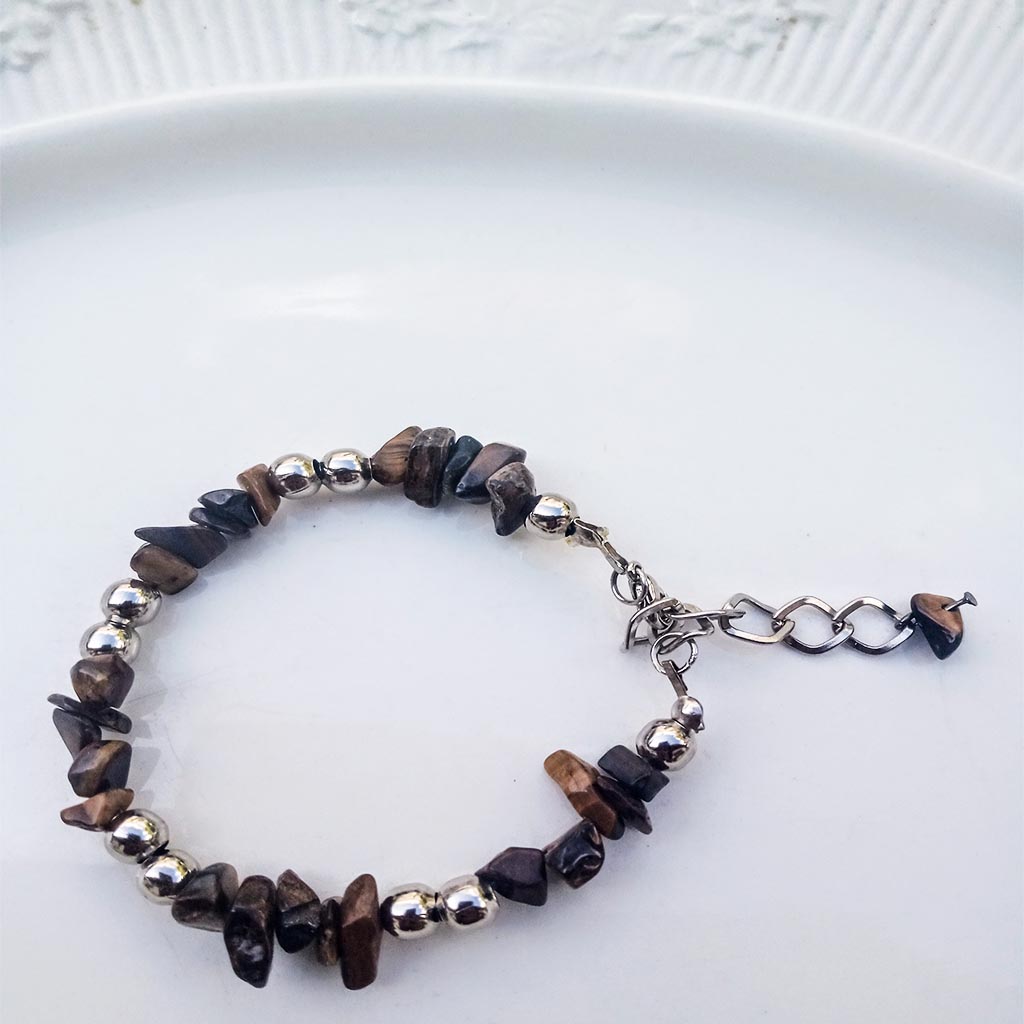 Pulsera de escallas de piedra natural de escallas de ojo de tigre enhebradas en tanza dura con terminaciones de acero no quirúrgico. Cierre mosquetón del mismo metal.
