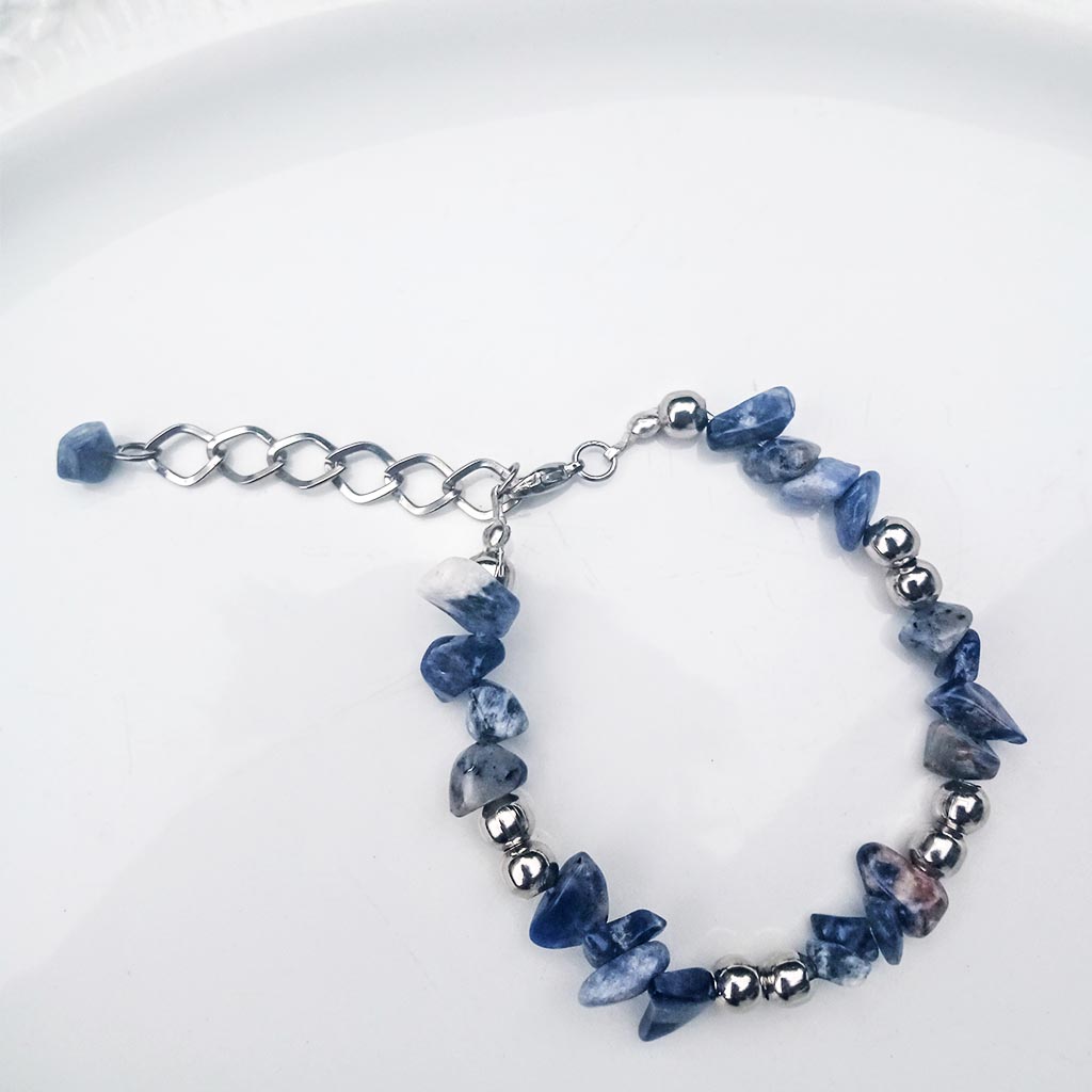 Pulsera de escallas de piedra natural de escallas de sodalita enhebradas en tanza dura con terminaciones de acero no quirúrgico. Cierre mosquetón del mismo metal.