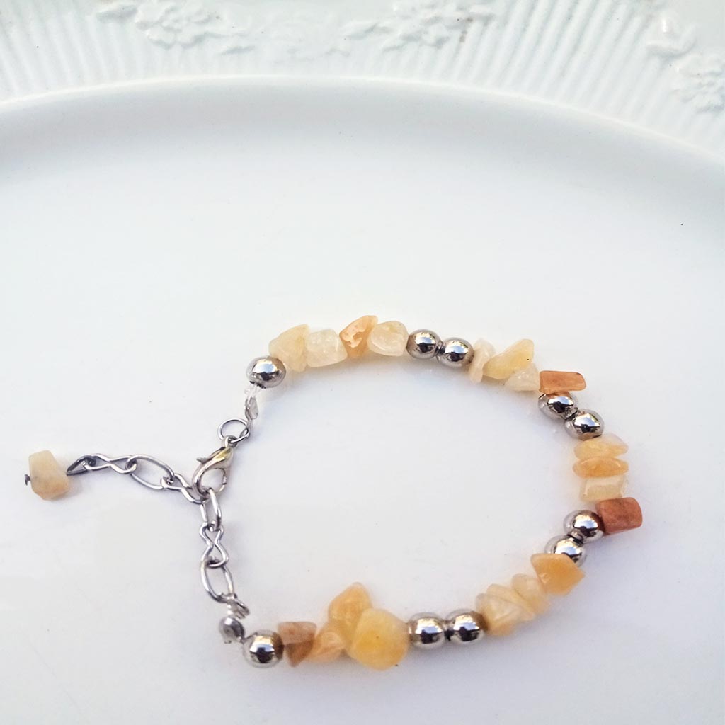 Pulsera de escallas de piedra natural de escallas de citrino enhebradas en tanza dura con terminaciones de acero no quirúrgico. Cierre mosquetón del mismo metal.