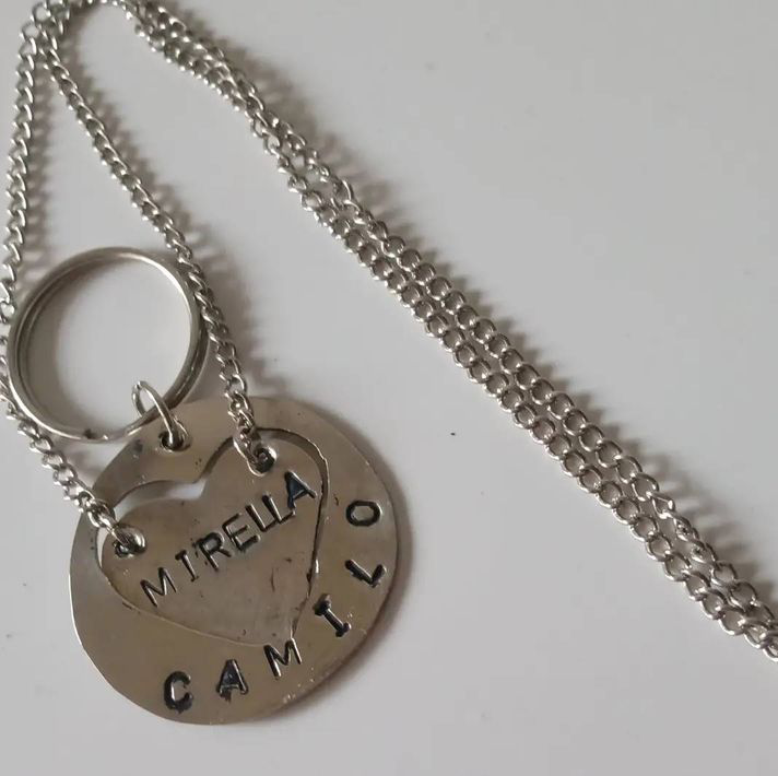 Podes grabar en la plaquita circular hasta 9 caracteres (esto incluye espacios), pueden ser letras y/o números. Y hasta 7 caracteres en el corazón.