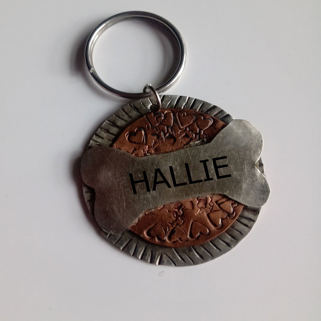 Chapita de identificación para tu mascota en forma circular de bronce cincelado con aplique de hueso en alpaca.