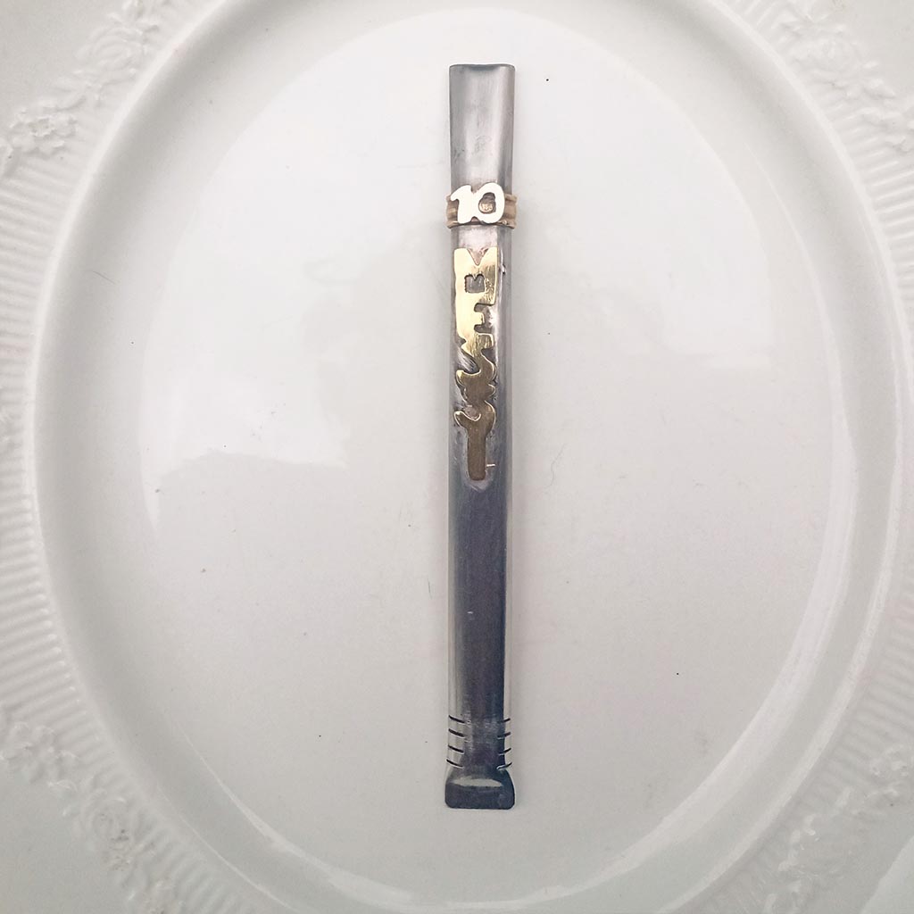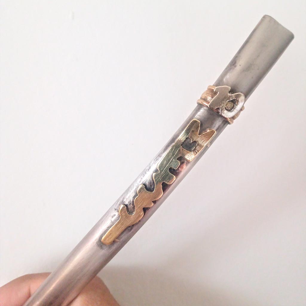 Bombilla con aplique palabra Messi y numero 10 hecho bronce y alpaca . Virola de bronce.