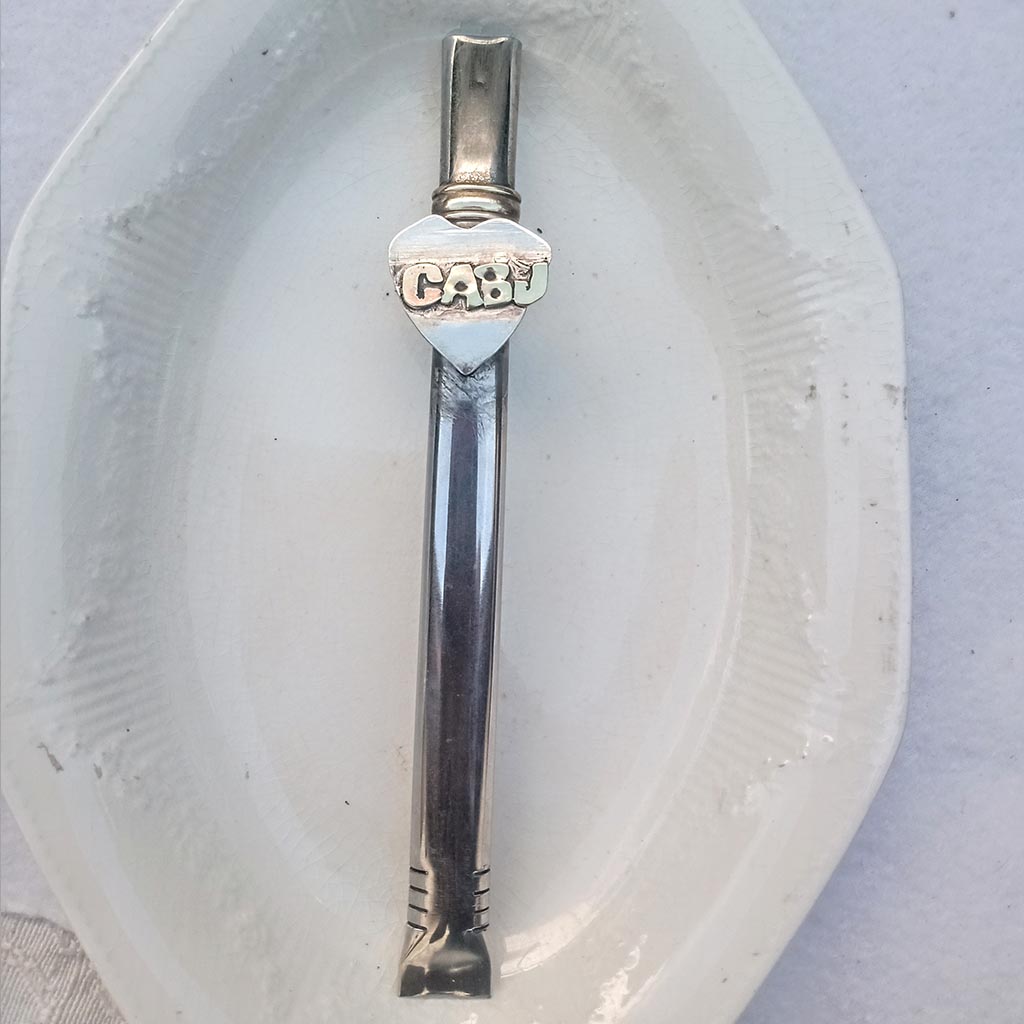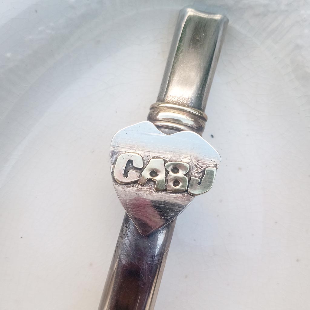 Bombilla con aplique de escudo de boca junior hecha en alpaca y bronce. ideal para fans